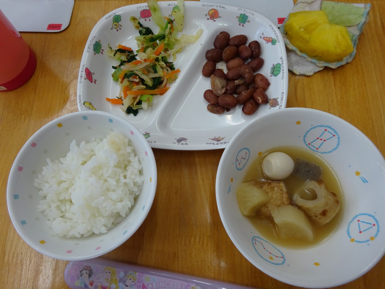11月29日(火)給食 ・ごはん ・関東煮(だいこん・厚揚げ・こんにゃく・うずら卵・ちくわ) ・小松菜の煮びたし(こまつな・きゃべつ・もやし・にんじん・かつお節) ・金時豆の甘煮 ・パイナップル