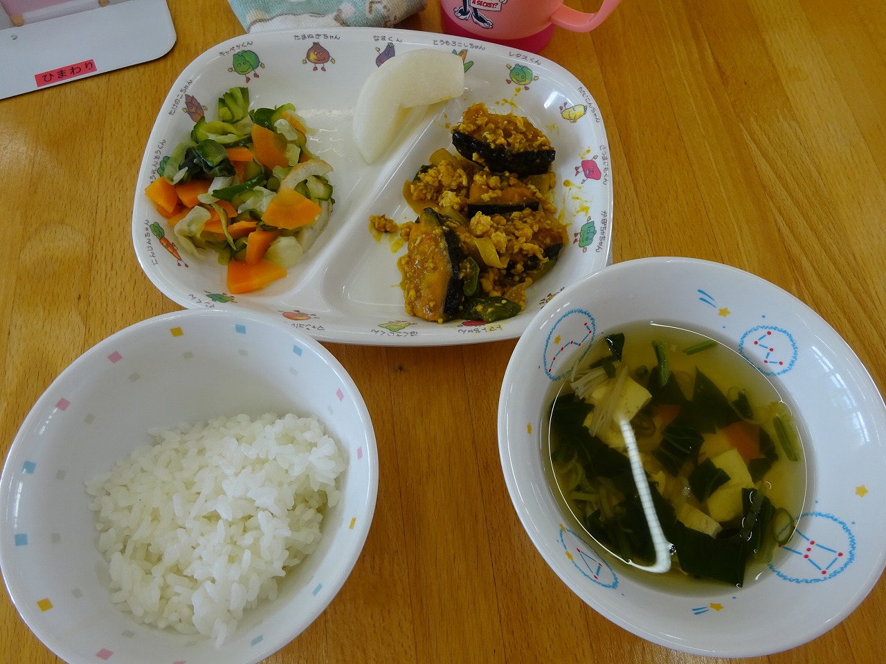 9月14日(水)給食 ・ごはん ・マーボー豆腐(豆腐・豚ひき肉・ねぎ・にんじん・干ししいたけ) ・甘酢あえ(キャベツ・きゅうり・にんじん・しらす干し・わかめ) ・かぼちゃ甘煮 ・プルーン
