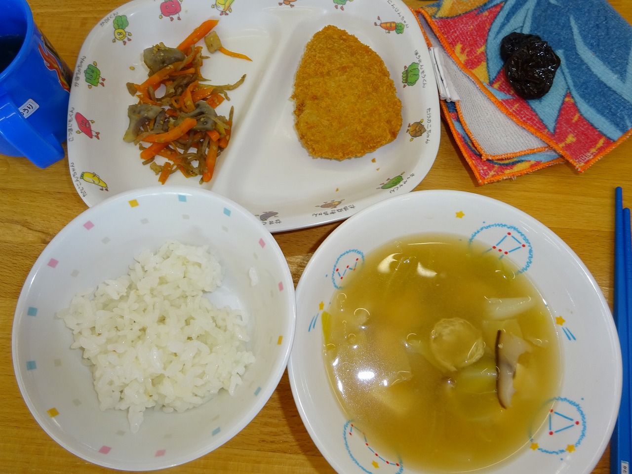 5月19日(木)給食 ・ごはん ・かつおフライ ・にんじんとセロリのきんぴら(にんじん・セロリ・ベーコン・れんこん・こんにゃく) ・みそ汁(豆腐・油揚げ・玉ねぎ・キャベツ・しいたけ・みそ) ・プルーン