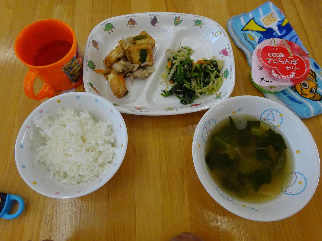 5月23日(月)給食 ・ごはn ・厚揚げの炒め物(厚揚げ・豚肉・玉ねぎ・にんじん・にら) ・ほうれん草のごまあえ(ほうれん草・キャベツ・もやし・にんじん・ごま) ・みそ汁(じゃがいも・こまつな・えのきたけ・みそ) ・さくらんぼゼリー