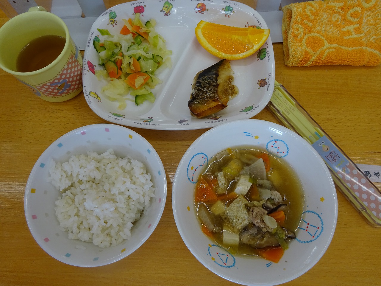 5月25日(水)給食 ・ごはん ・さばのごまだれかけ ・チップスサラダ(ポテトチップス・キャベツ・きゅうり・にんじん) ・豚汁(豚肉・だいこん・にんじん・ごぼう・豆腐・油揚げ・ねぎ) ・オレンジ