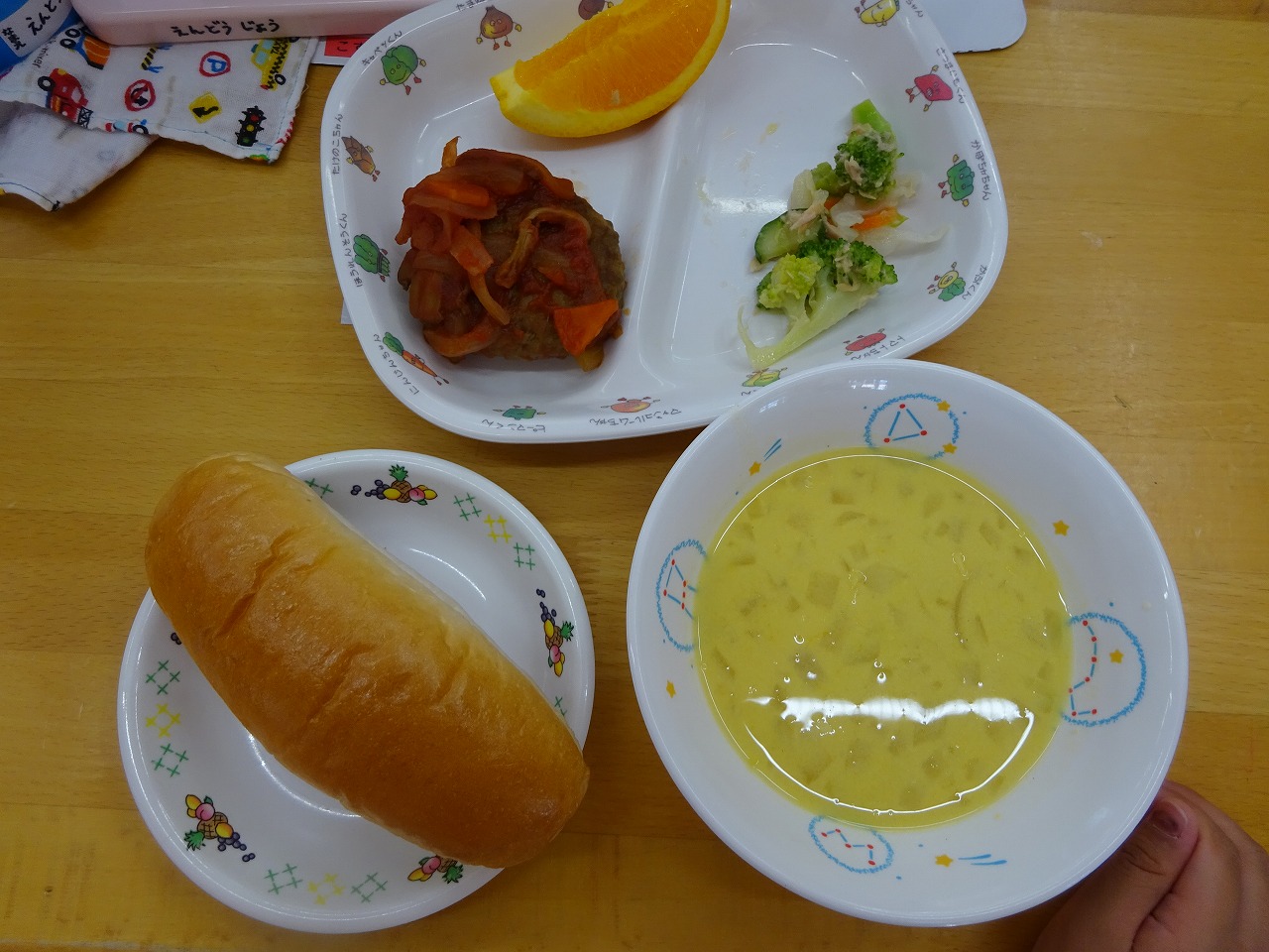5月30日(月)給食 ・ロールパン ・煮込みハンバーグ(ハンバーグ・玉ねぎ・にんじん・マッシュルーム) ・キャベツサラダ(キャベツ・ツナ・きゅうり・にんじん・ブロッコリー) ・コーンポタージュ(コーン・玉ねぎ・かぼちゃ・豆乳) ・オレンジ
