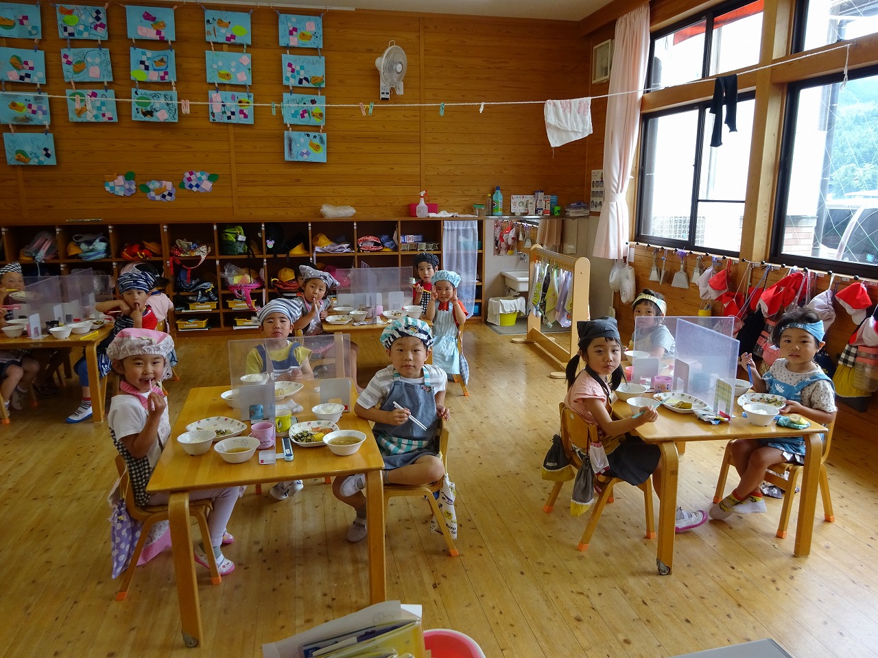 5月31日(火)給食 ・ごはん ・さけの香草焼き(さけ・パセリ・オリーブ油) ・ひじきサラダ(ひじき・きゅうり・キャベツ・にんじん・コーン・マヨドレ) ・みそ汁(豆腐・油揚げ・だいこん・ねぎ・みそ) ・バナナ 今日は、年中 こすもす組で給食を食べている様子を撮りました。