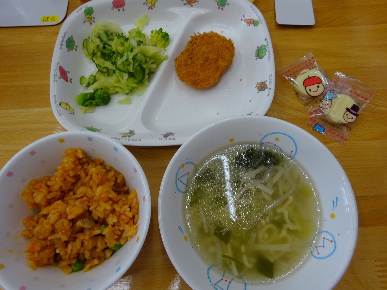 1月17日(月)給食 ・ケチャップライス(米・鶏肉・玉ねぎ・にんじん・グリンピース) ・ミニ野菜コロッケ ・グリーンサラダ(キャベツ・ブロッコリー・きゅうり) ・ABCスープ(マカロニ・チンゲン菜・えのきたけ・もやし・ねぎ) ・チーズ ・