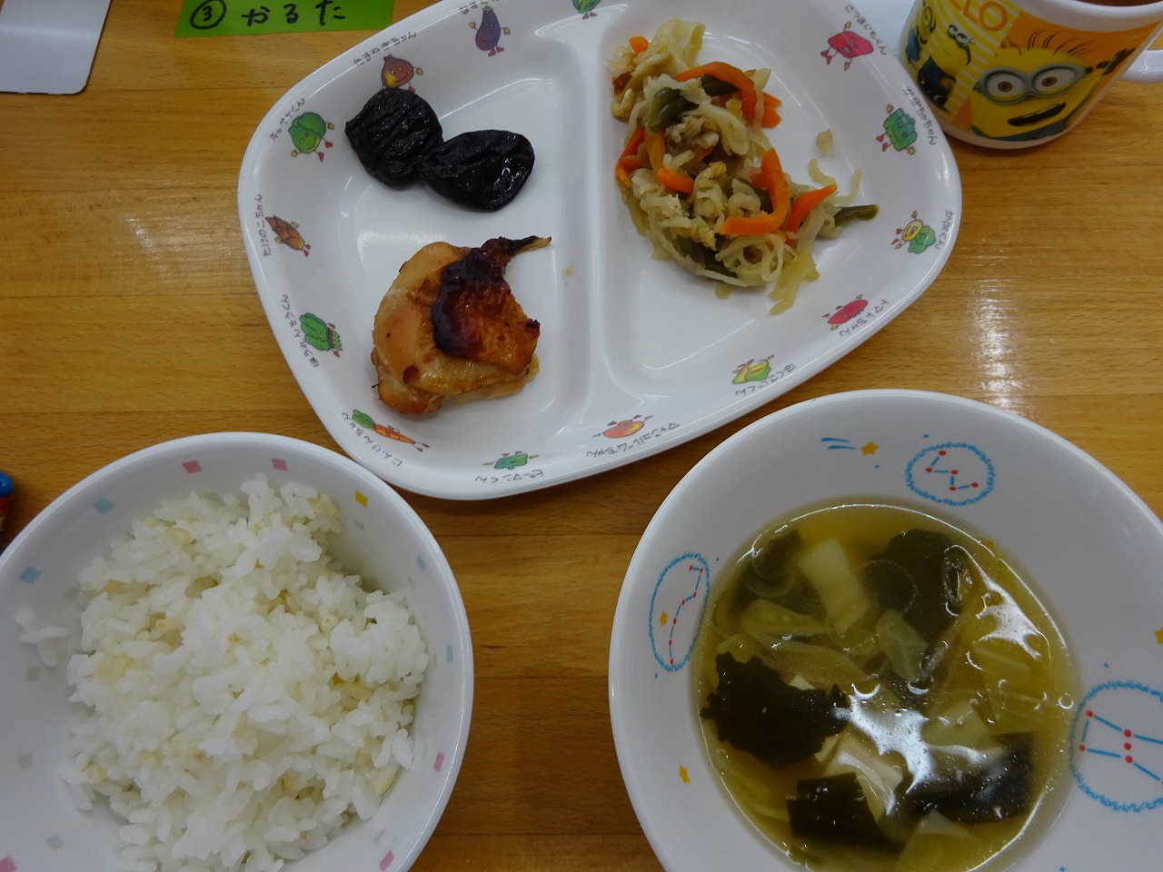 1月21日(金)給食 ・ごはん ・鶏肉の照り焼き ・切干大根の煮物(切干大根・油揚げ・にんじん・ちくわ・いんげん) ・みそ汁(豆腐・じゃがいも・キャベツ・ねぎ・わかめ) ・プルーン