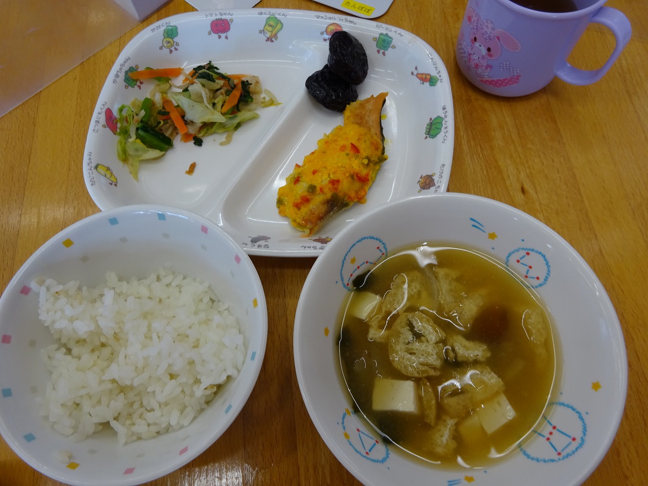 10月20日(水)給食 ・ごはん ・鮭の野菜マヨ焼き(鮭・にんじん・ピーマン・パプリカ・マヨドレ) ・小松菜の和え物(小松菜・キャベツ・にんじん・もやし・かつお節) ・みそ汁(豆腐・油揚げ・なめこ・玉ねぎ・わかめ・みそ) ・プルーン