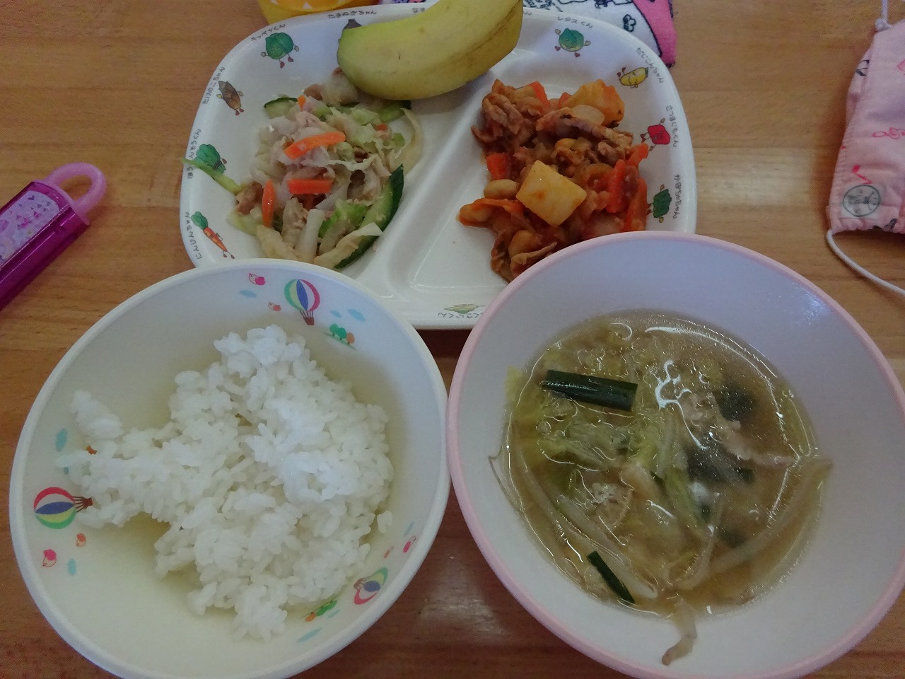 10月21日(木)給食 ・ごはん ・ポークビーンズ(豚肉・大豆・にんじん・玉ねぎ・じゃが芋・トマト・ケチャップ) ・切干大根サラダ(切干だいこん・キャベツ・にんじん・きゅうり・ツナ) ・もやしスープ(もやし・鶏肉・油揚げ・白菜・にら) ・バナナ