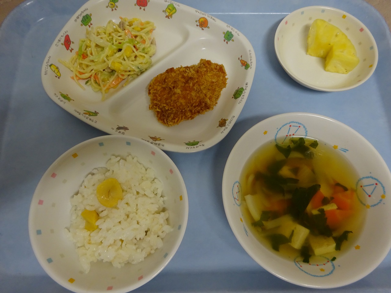 10月22日(金)給食 ・栗ごはん(米・くり) ・チキンカツ(鶏肉・卵・小麦粉・パン粉) ・サラスパサラダ(サラスパ・キャベツ・きゅうり・にんじん・マヨドレ) ・すまし汁(豆腐・かまぼこ・にんじん・玉ねぎ・みつば) ・パイナップル
