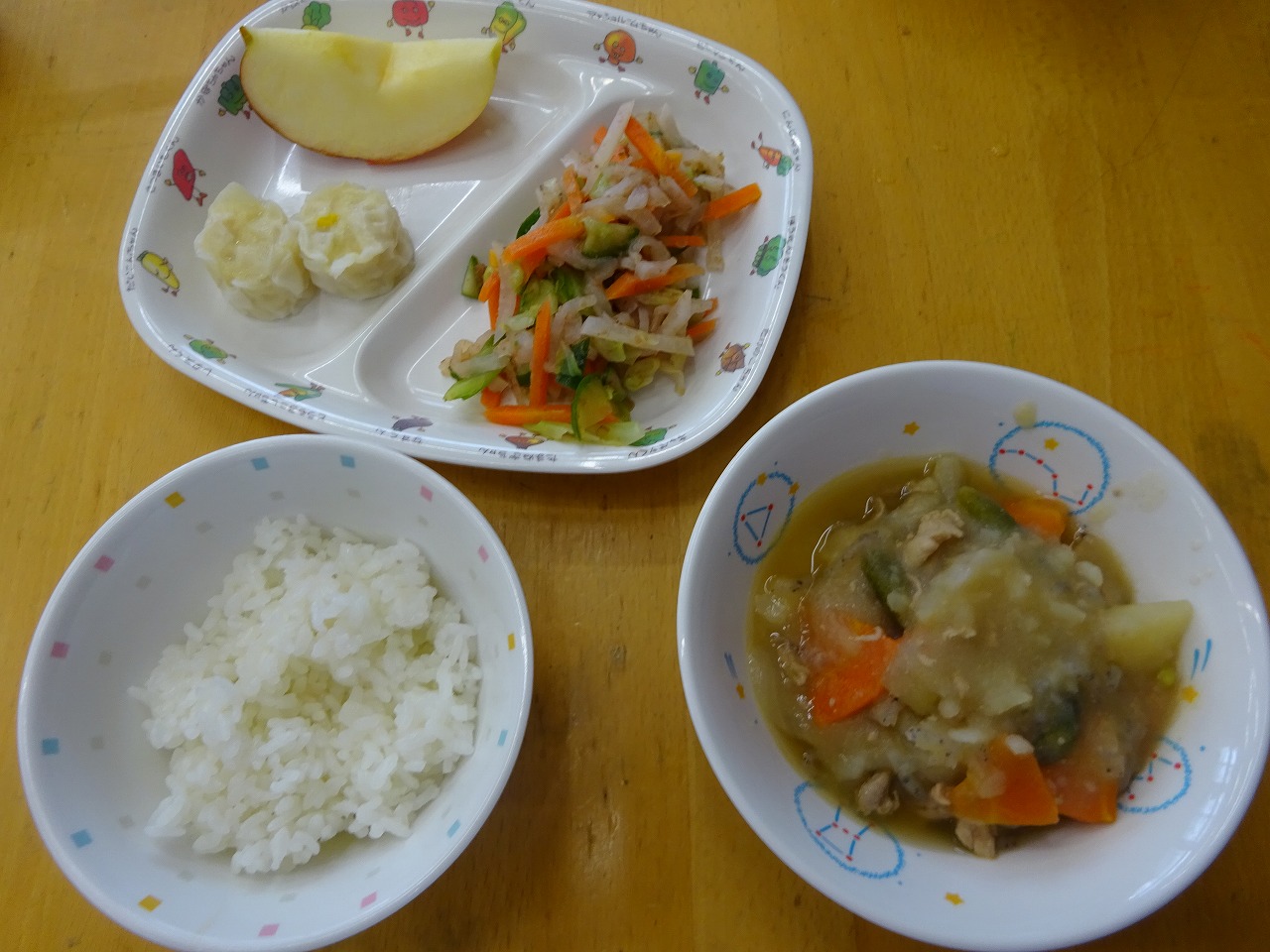 10月25日(月)給食 ・ごはん ・肉じゃが(じゃがいも・豚肉・玉ねぎ・にんじん・こんにゃく) ・大根の梅かつお和え(だいこん・きゅうり・にんじん・キャベツ・梅びしお) ・蒸しコーンシューマイ ・りんご
