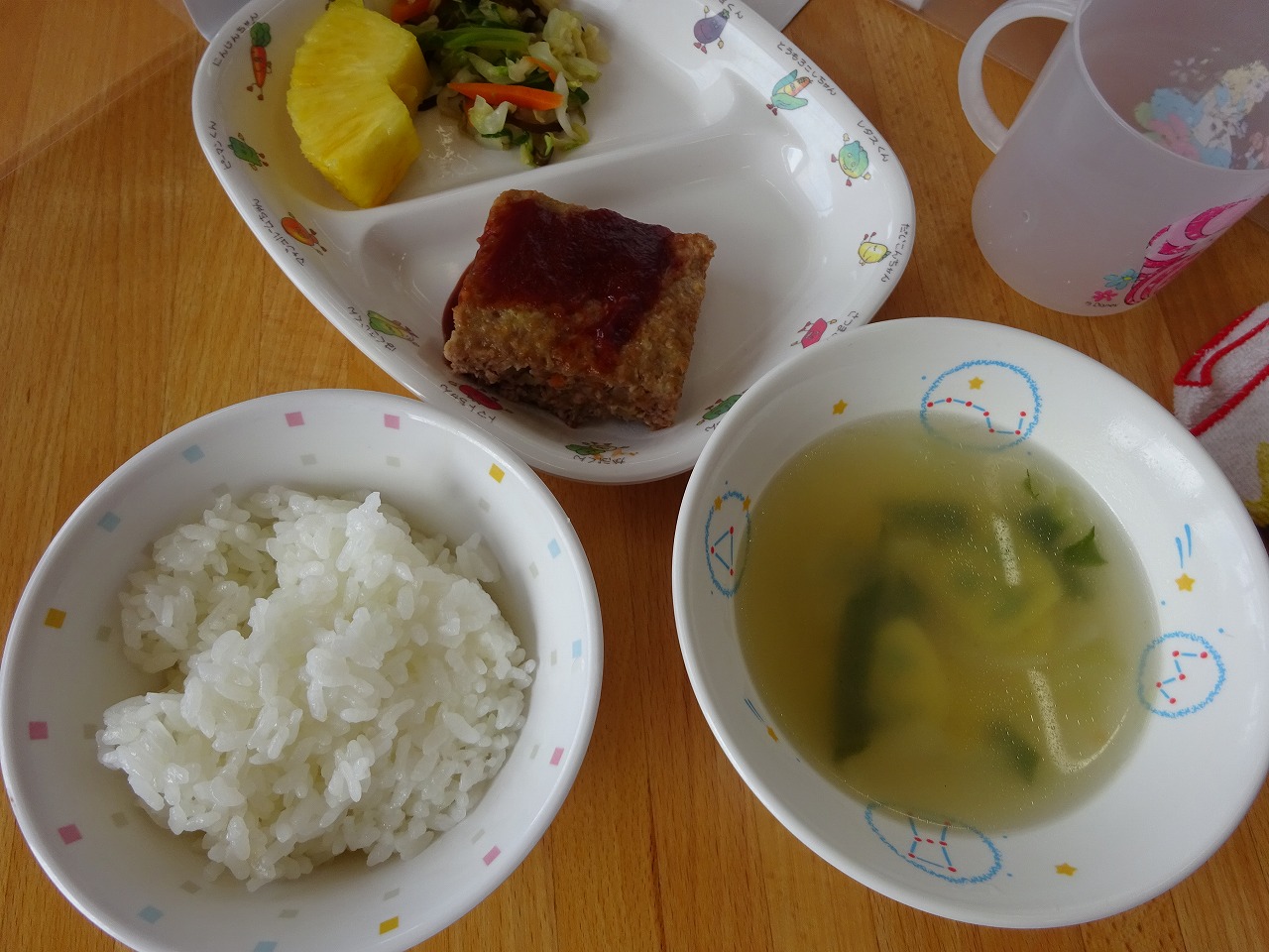 10月27日(水)給食 ・ごはん ・ミートローフ(合挽肉・玉ねぎ・にんじん・卵・グリンピース・牛乳) ・塩昆布あえ(キャベツ・きゅうり・にんじん・塩昆布) ・コンソメスープ(チンゲン菜・しめじ・もやし・ねぎ) ・パイナップル