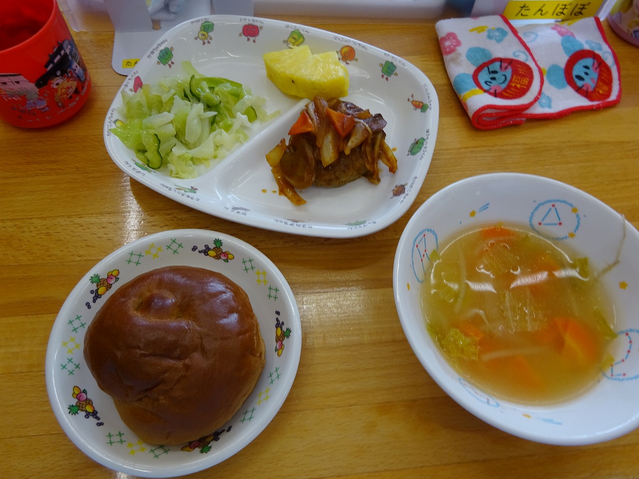 9月30日(木)給食 ・黒糖パン ・ハンバーグ デミグラスソース(ハンバーグ・玉ねぎ・にんじん・マッシュルーム) ・グリーンサラダ(ブロッコリー・きゅうり・にんじん) ・トマトスープ(トマト・レタス・玉ねぎ・もやし・にんじん) ・パイナップル
