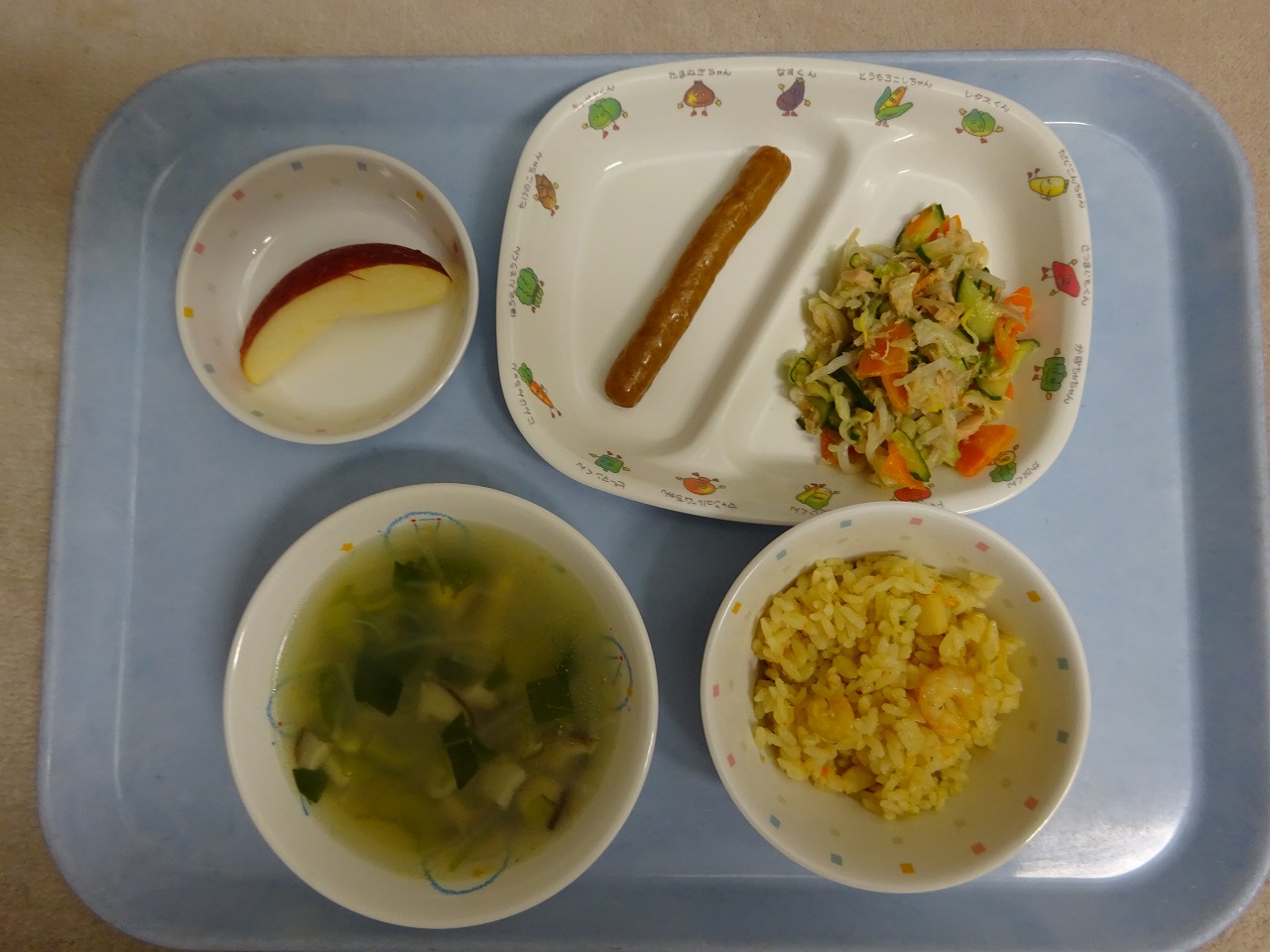 10月11日(月)給食 ・エビチャーハン(米・えび・いか・玉ねぎ・にんじん・ピーマン) ・ウインナー ・中華あえ(キャベツ・ツナ・にんじん・きゅうり・もやし) ・春雨スープ(マロニー・チンゲン菜・コーン・しいたけ・ねぎ) ・りんご