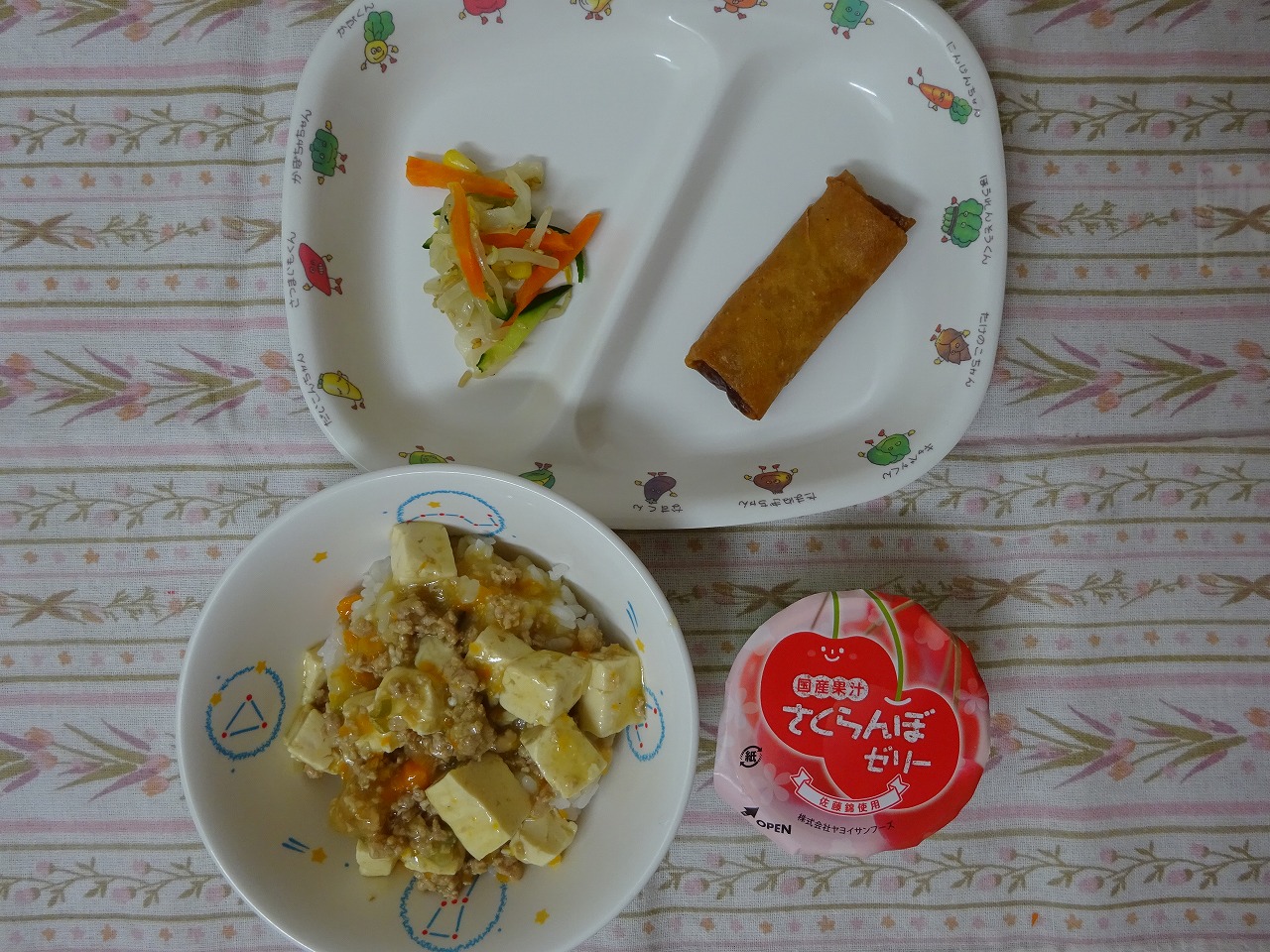 6月24日(月)給食 ・マーボー豆腐丼 ・ミニ春巻き ・もやしナムル ・さくらんぼゼリー