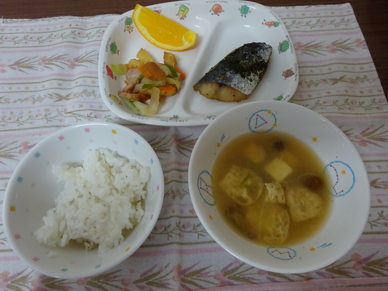 6月26日(水)給食 ・ごはん ・さわらの香草焼き ・いろどりソテー ・みそ汁 ・オレンジ