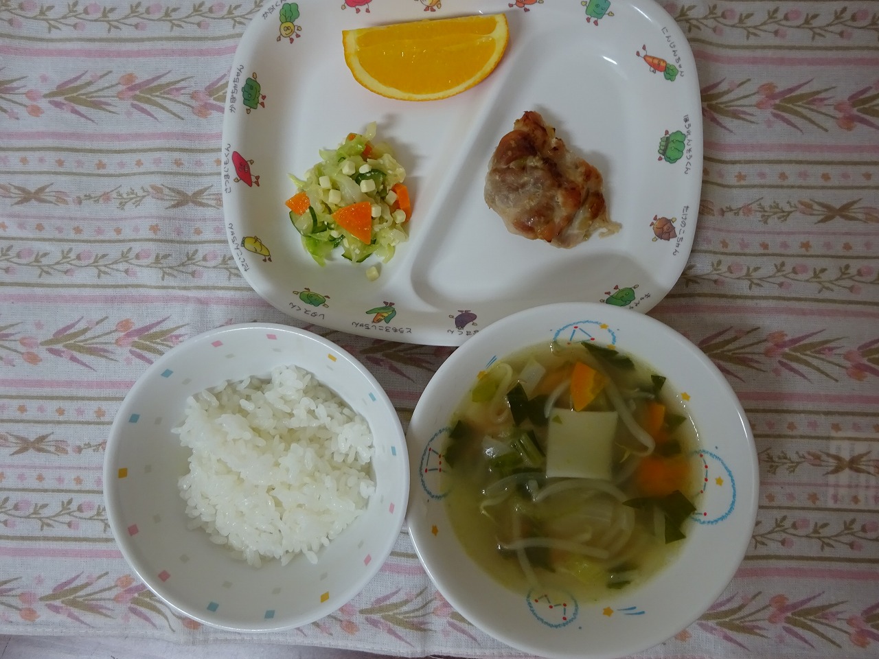 7月1日(月)給食 ・ごはん ・鶏肉の香味焼き ・チーズサラダ ・ワンタンスープ ・オレンジ