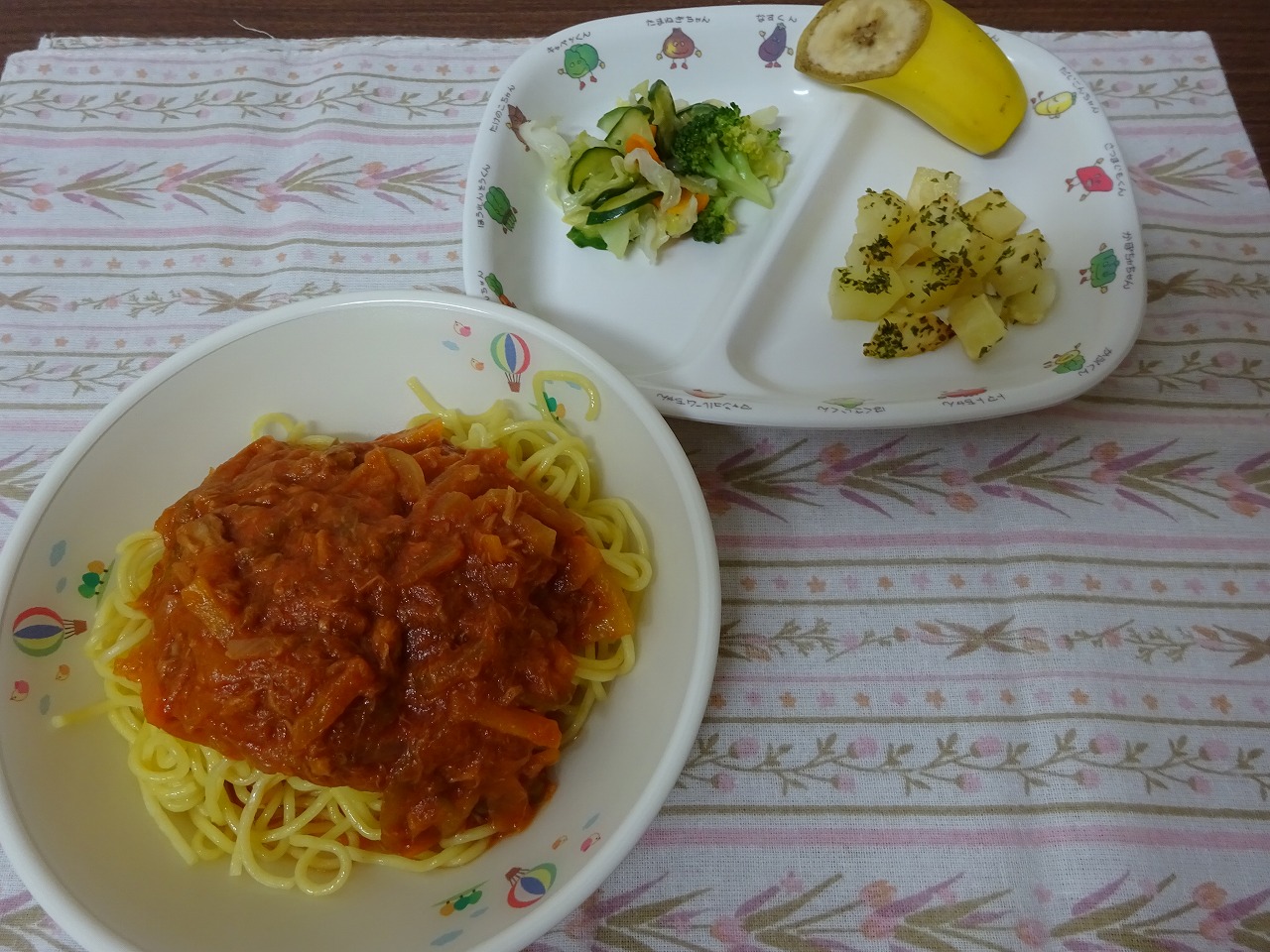 7月3日(水)給食 ・ツナスパゲッティ ・じゃが芋のオーブン焼き ・レモンドレッシングサラダ ・バナナ
