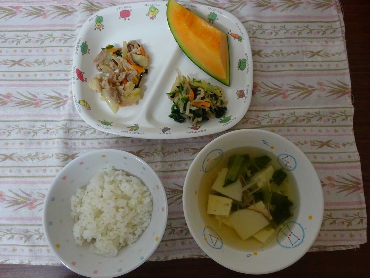 7月4日(木)給食 ・ごはん ・豚肉の生姜焼き ・ほうれん草のおひたし ・すまし汁 ・メロン