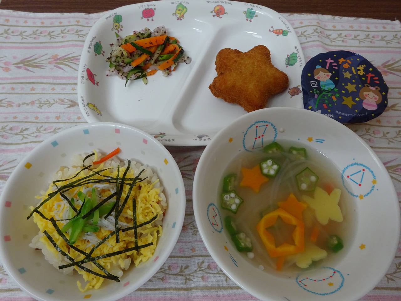 7月5日(金)給食:七夕メニュー ・ちらし寿司 ・星のコロッケ ・ゆかり和え ・天の川スープ ・七夕お星さま三色ゼリー