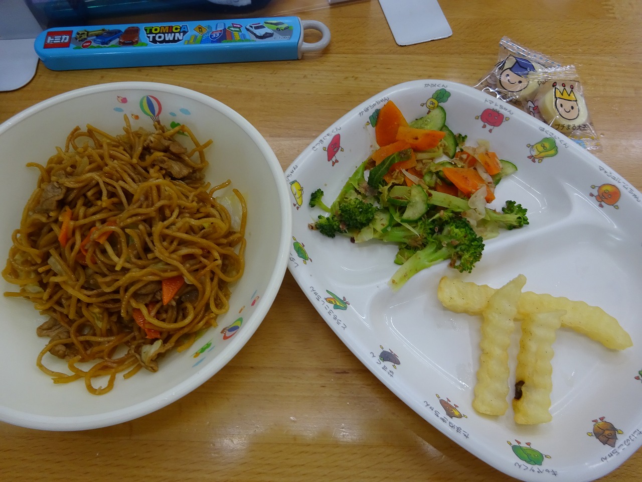 7月8日(木)給食 ・焼きそば(麺・豚肉・キャベツ・にんじん・玉ねぎ・ピーマン・あおさ粉) ・ブロッコリーのおかかあえ(ブロッコリー・きゅうり・にんじん・かつお節) ・フライドポテト ・チーズ