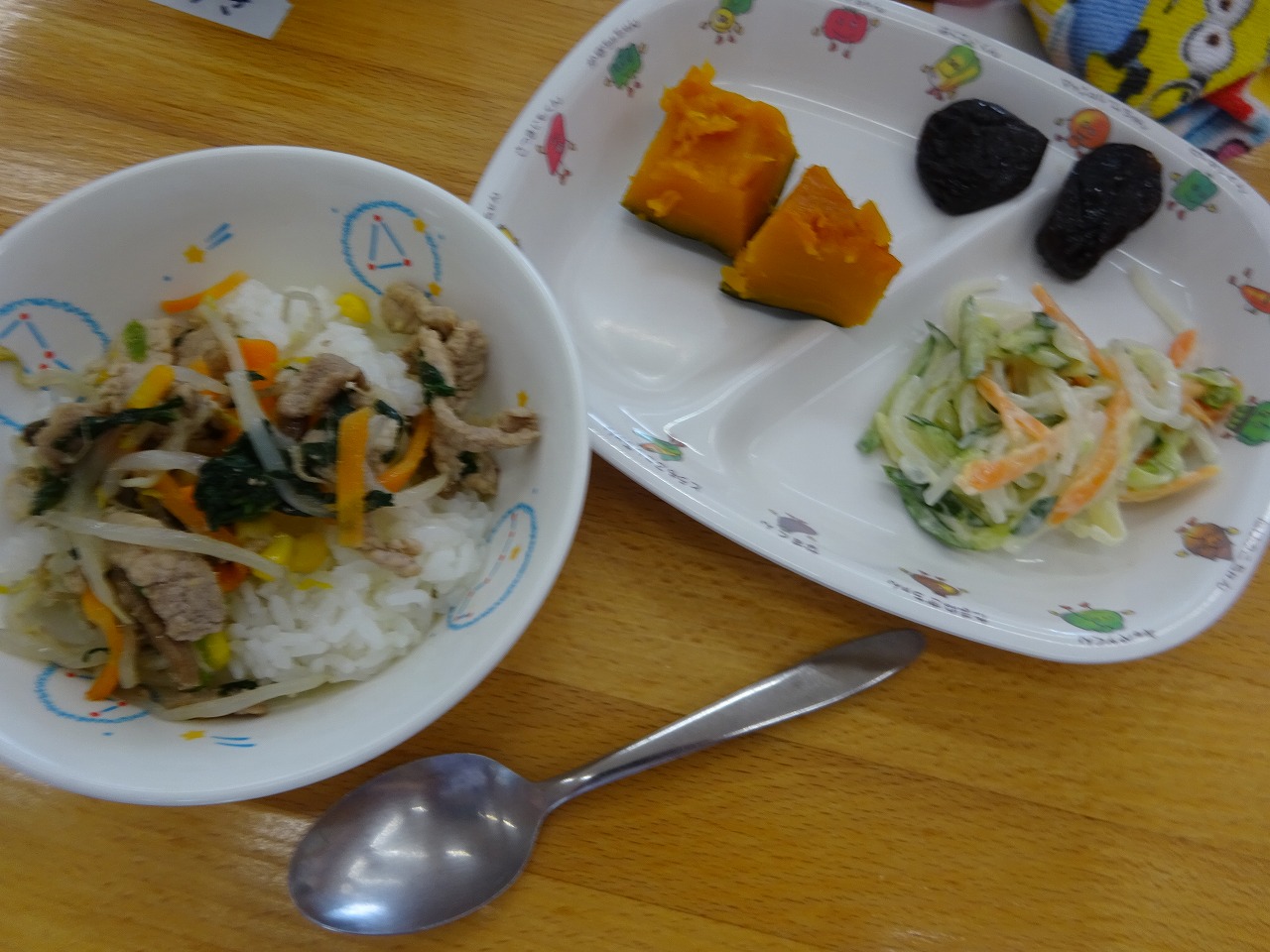 7月12日(月)給食 ・ビビンバ(米・豚肉・もやし・にんじん・ほうれん草・ぜんまい・コーン) ・シルバーサラダ(マロニー・きゅうり・にんじん・キャベツ・マヨドレ) ・かぼちゃ甘煮 ・プルーン