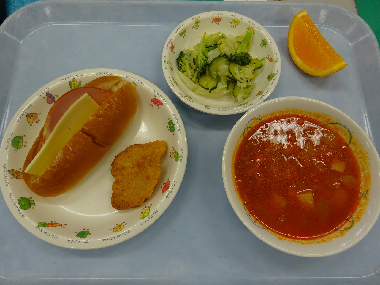 7月13日(火)給食 ・サンドパン(ハム・チーズ) ・チキンナゲット ・グリーンサラダ(キャベツ・きゅうり・ブロッコリー) ・ミネストローネ(ツナ・玉ねぎ・にんじん・じゃが芋・トマト) ・オレンジ