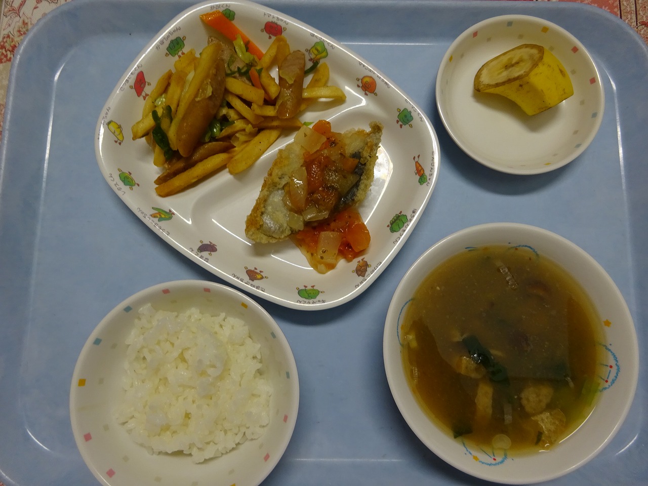7月14日(水)給食 ・ごはん ・さわらのエスカベッシュ(さわら・玉ねぎ・トマト・パセリ) ・いろどりソテー(ウインナー・フライドポテト・キャベツ・にんじん) ・みそ汁(豆腐・油揚げ・なめこ・ねぎ・みそ) ・バナナ