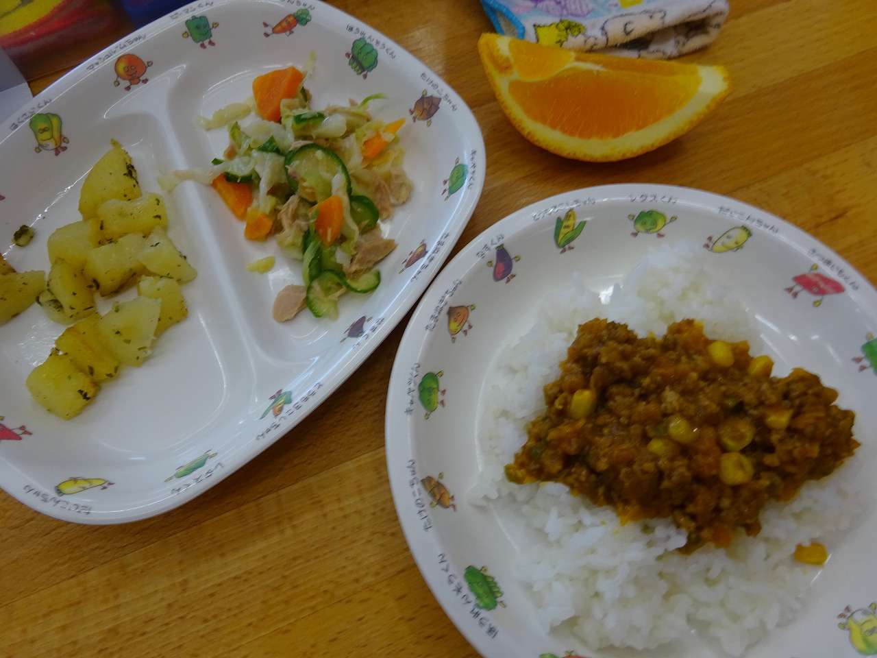 7月19日(月)給食 ・ドライカレー(米・豚挽肉・玉ねぎ・にんじん・ピーマン・コーン) ・ツナサラダ(ツナ・キャベツ・きゅうり・にんじん) ・じゃが芋のオーヴン焼き ・オレンジ