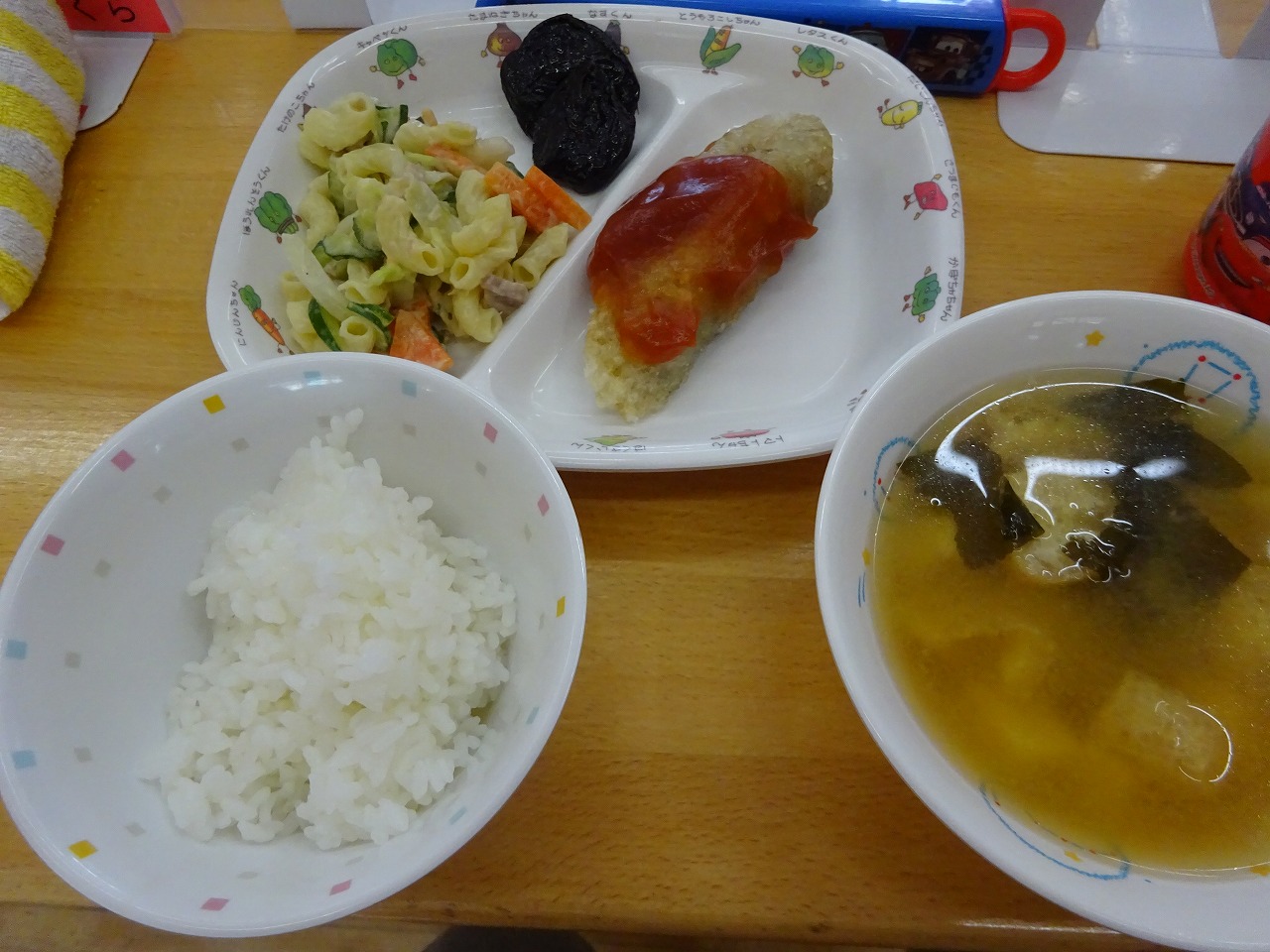 6月8日(火)給食 ・ごはん ・さわらの甘酢あん ・マカロニサラダ(マカロニ・ハム・キャベツ・きゅうり・にんじん・マヨドレ) ・みそ汁(豆腐・油揚げ・じゃがいも・玉ねぎ・わかめ・みそ) ・プルーン