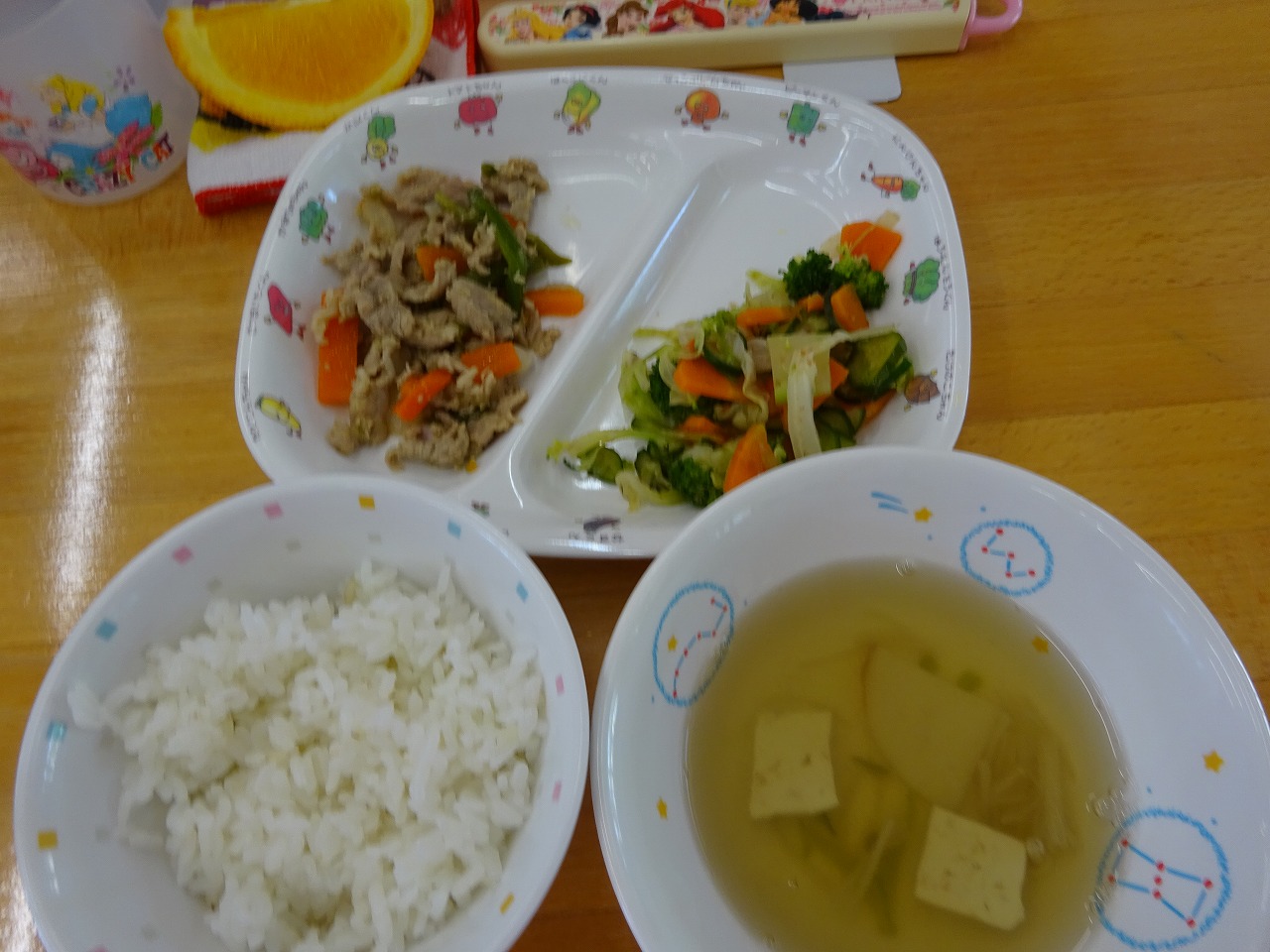 6月9日(水)給食 ・ごはん ・豚肉と玉ねぎのソテー(豚肉・玉ねぎ・ピーマン・にんじん・いんげん) ・ブロッコリーのおかかあえ(ブロッコリー・キャベツ・きゅうり・にんじん・かつお節) ・すまし汁(豆腐・かまぼこ・えのきたけ・さやえんどう) ・オレンジ おやつは、『黒糖蒸しパン』