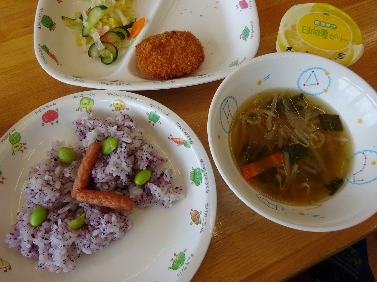 6月10日(木)給食 ・とけいごはん(米・ウインナー・えだまめ) ・野菜コロッケ ・フレンチサラダ(キャベツ・きゅうり・にんじん・コーン) ・中華スープ(チンゲン菜・玉ねぎ・もやし・にんじん・ねぎ) ・ゼリー