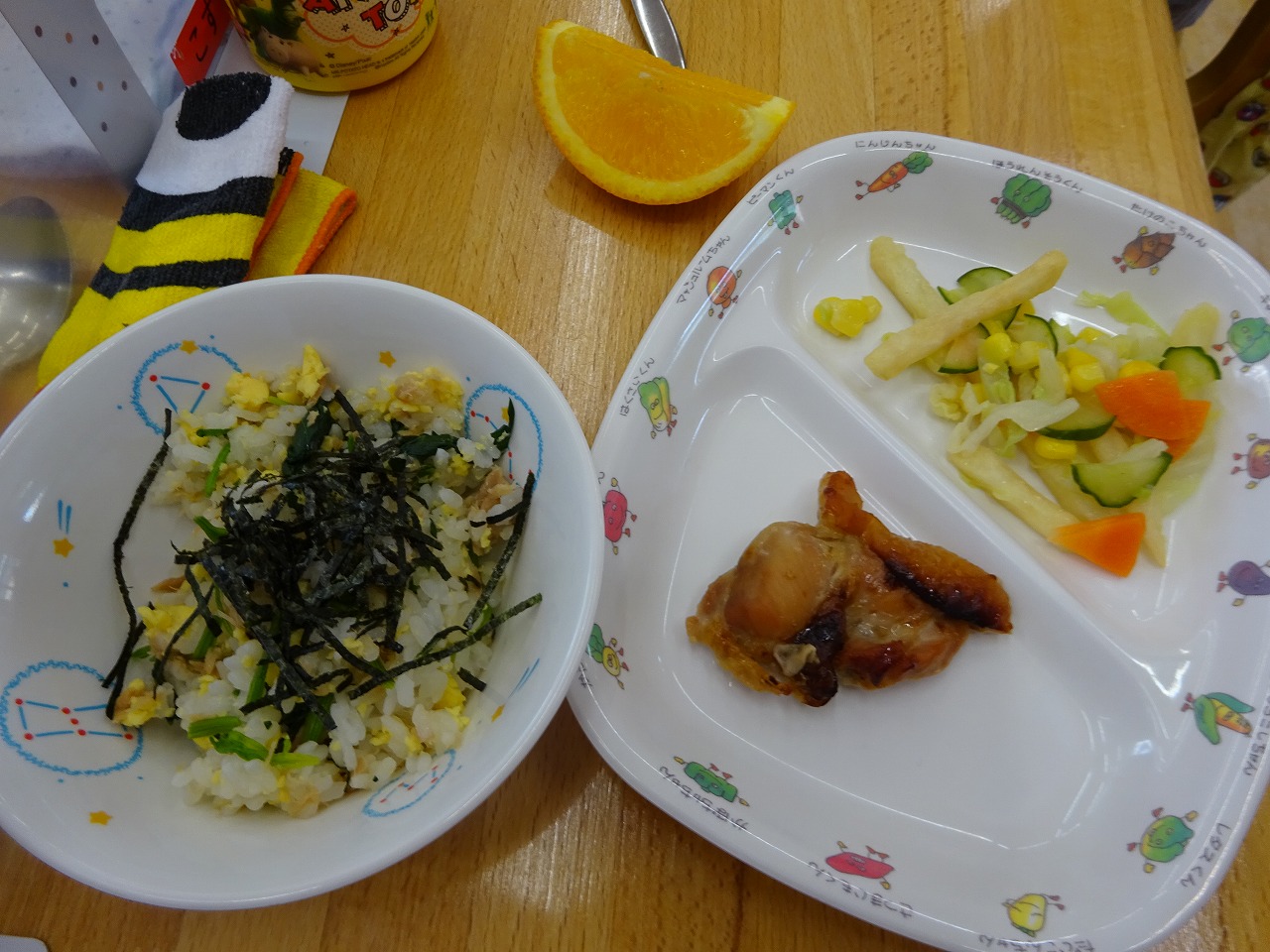 6月14日(月)給食 ・三色どんぶり(米・ツナ・卵・ほうれん草・のり) ・鶏肉の照り焼き ・しょうゆフレンチ(キャベツ・きゅうり・にんじん・ポテト・コーン) ・オレンジ
