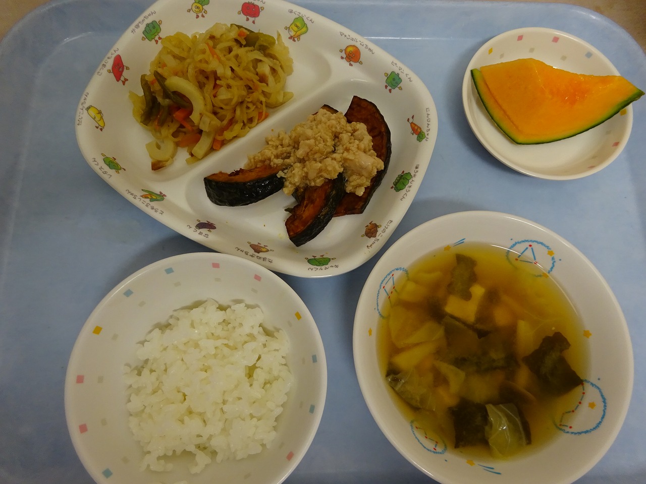 6月15日(火)給食 ・ごはん ・かぼちゃそぼろあんかけ(かぼちゃ・鶏ひき肉) ・切干大根の煮物(切干大根・油揚げ・ちくわ・にんじん・いんげん) ・みそ汁(豆腐・キャベツ・玉ねぎ・しめじ・わかめ) ・メロン