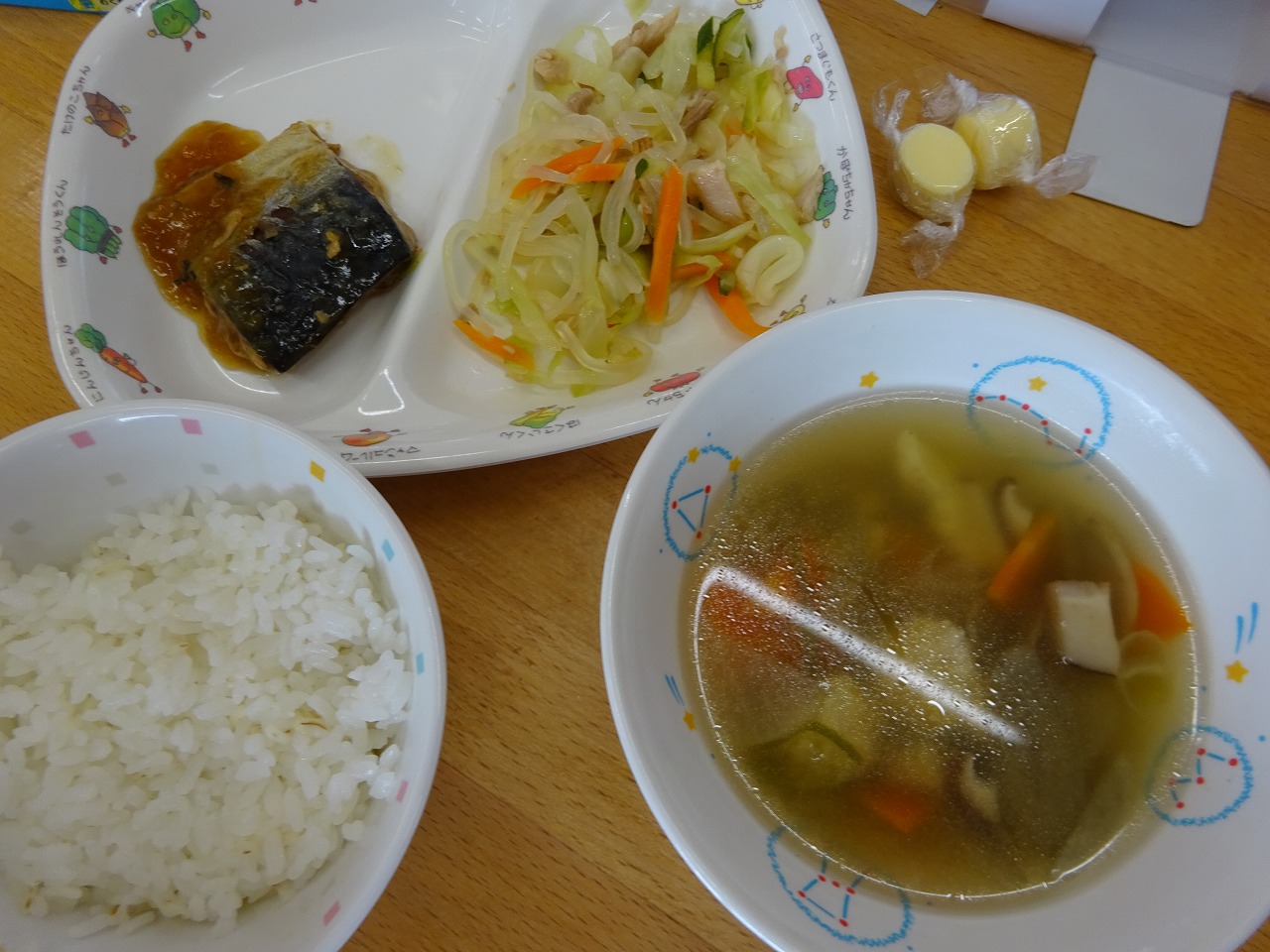 6月16日(水)給食 ・ごはん ・さばのみそ煮 ・マロニー中華和え(マロニー・きゃべつ・きゅうり・にんじん・ハム) ・ごもく汁(豆腐・だいこん・にんじん・ごぼう・しいたけ・わかめ) ・チーズ