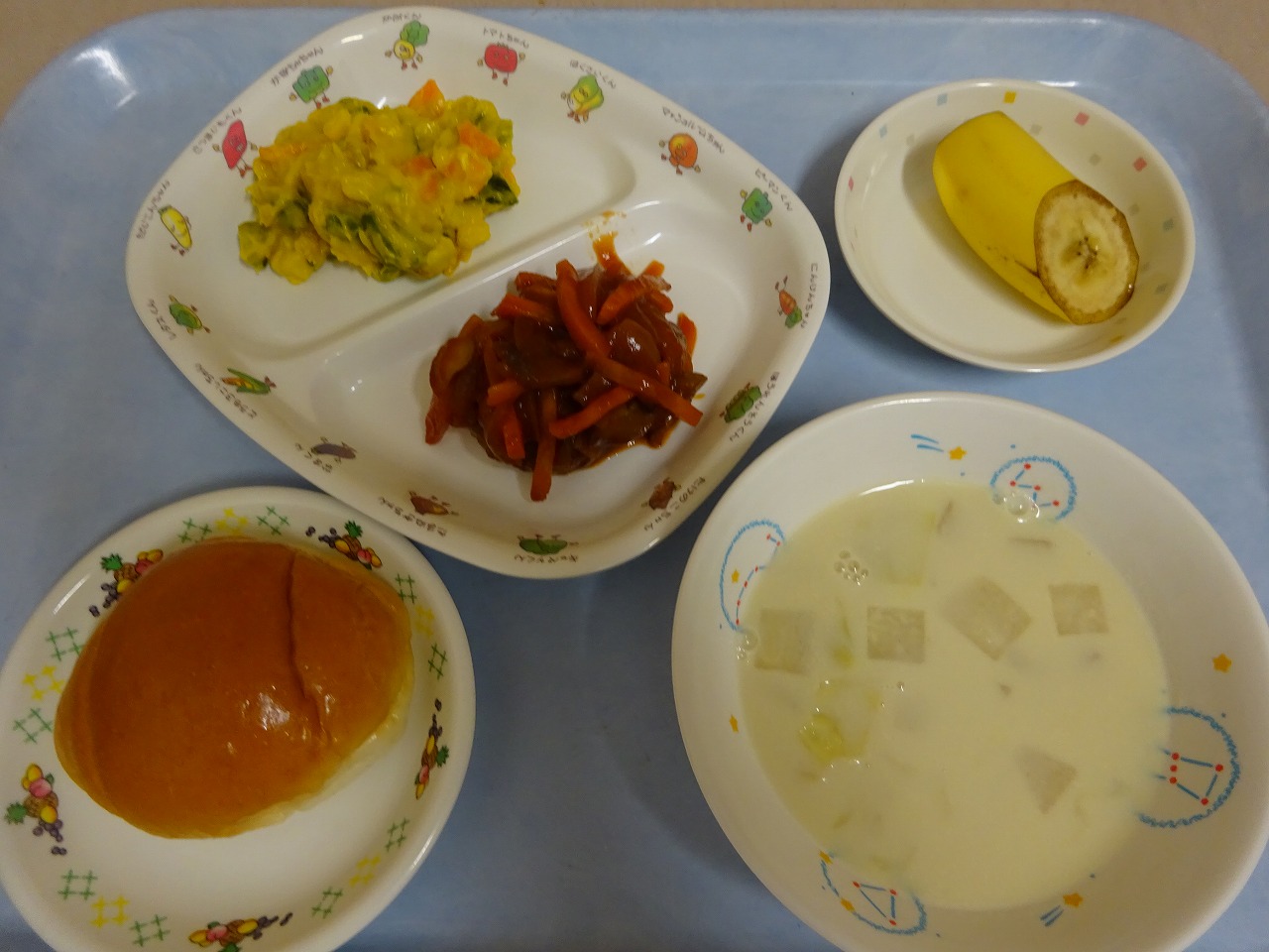 6月18日(金)給食 ・ロールパン ・煮込みハンバーグ(ハンバーグ・玉ねぎ・にんじん・マッシュルーム) ・かぼちゃサラダ(かぼちゃ・ハム・きゅうり・にんじん・コーン・マヨ) ・豆乳スープ(キャベツ・玉ねぎ・しめじ・だいこん・豆乳) ・バナナ
