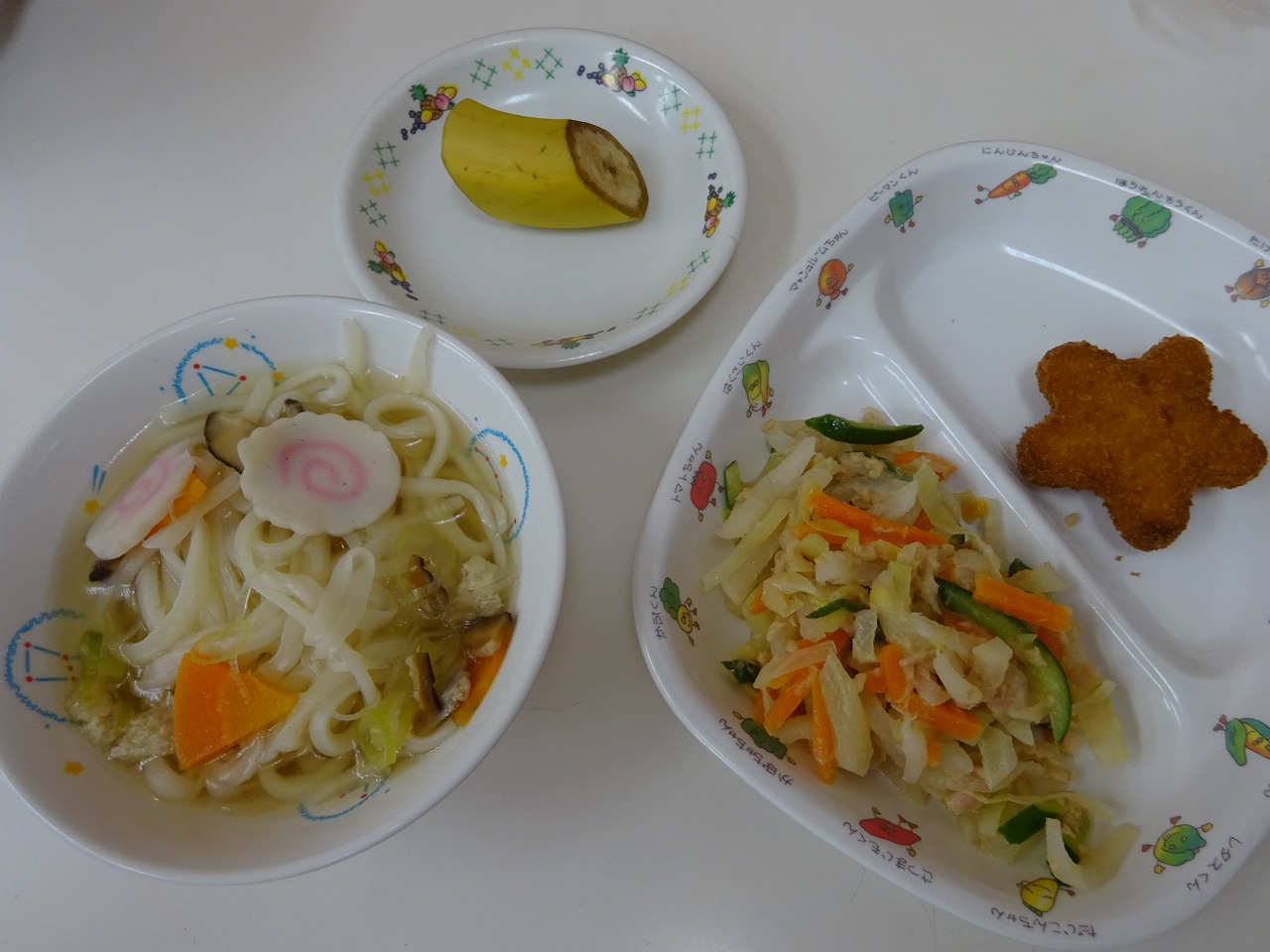4月22日(木)給食 ・うどん(麺・鶏肉・油揚げ・なると・にんじん・ねぎ・干ししいたけ) ・星のコロッケ ・だいこんサラダ(だいこん・キャベツ・きゅうり・にんじん・ツナ) ・バナナ