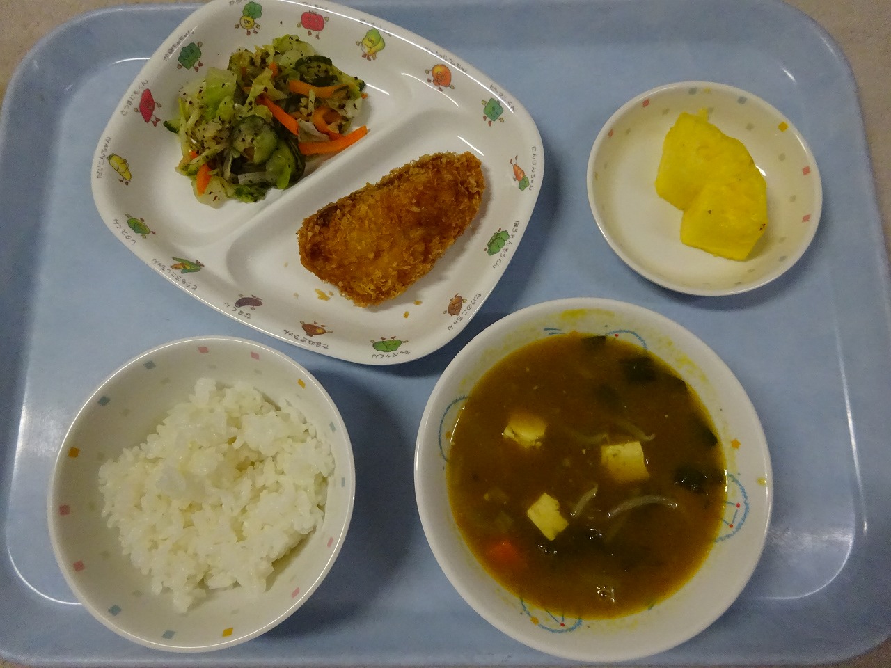 4月28日(水)給食 ・ごはん ・白身魚フライ(たら・小麦粉・卵・パン粉) ・ゆかりあえ(キャベツ・きゅうり・にんじん・ゆかり) ・豆腐のカレー汁(豆腐・玉ねぎ・にんじん・チンゲン菜・もやし) ・パイナップル