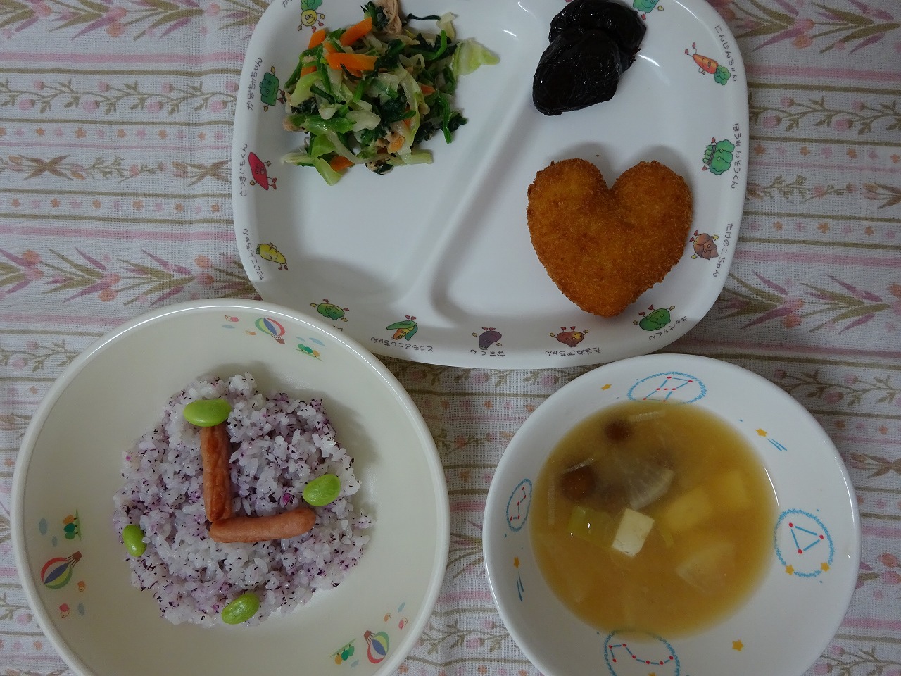 6月10日(月)給食:時の記念日メニュー ・時計ごはん ・ハートコロッケ ・かわりおひたし ・みそ汁 ・プルーン