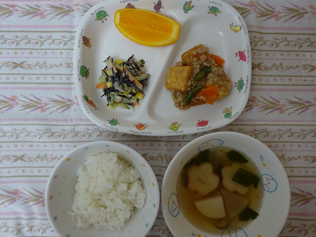 6月11日(火)給食 ・ごはん ・厚揚げのそぼろ煮 ・ひじきサラダ ・すまし汁 ・オレンジ