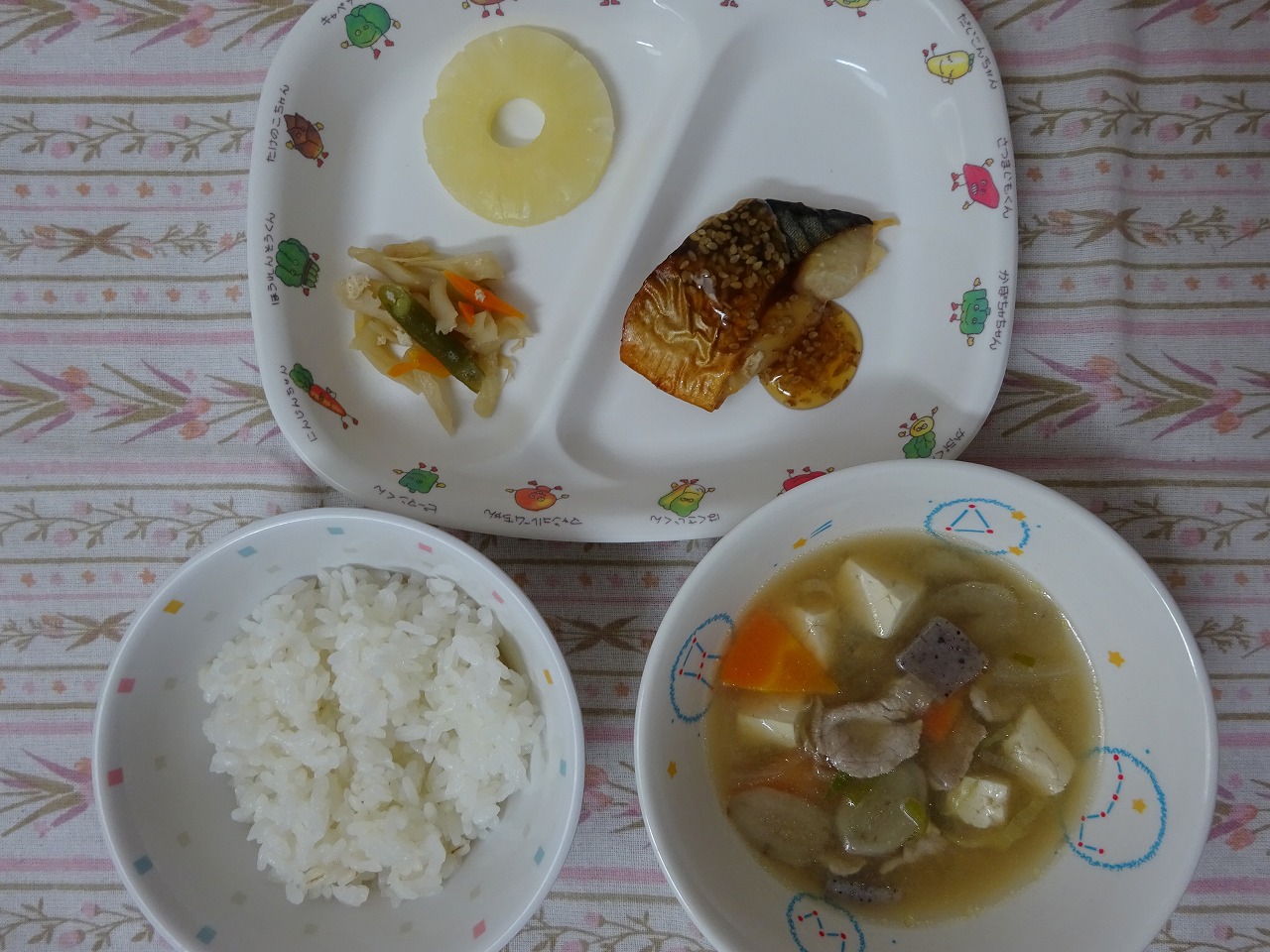 6月13日(木)給食 ・ごはん ・さばのごまだれがけ ・切干大根の煮物 ・豚汁 ・ベビーパイン