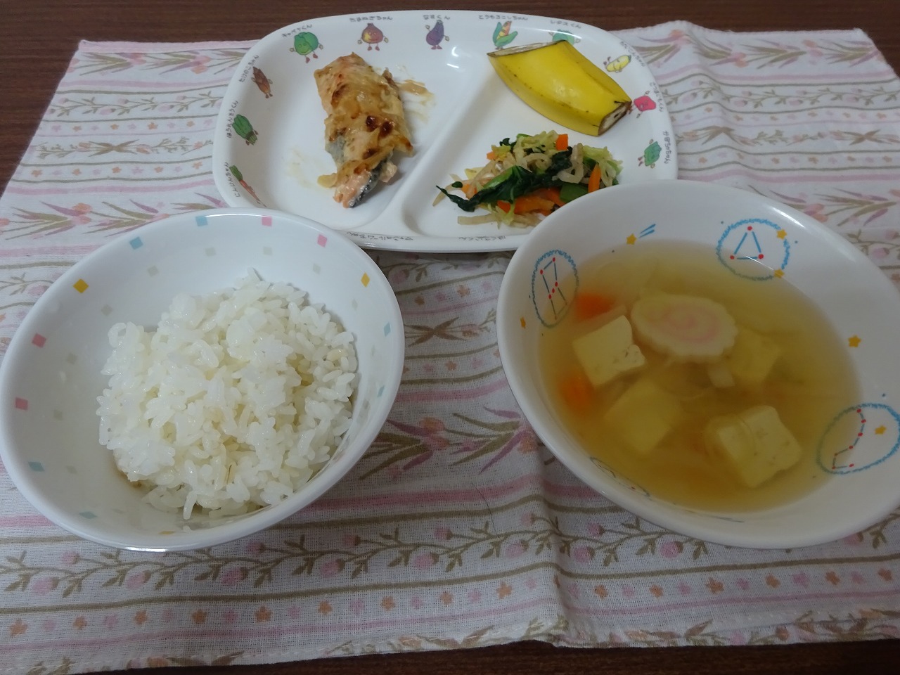6月20日(木)給食 ・ごはん ・鮭の味噌マヨ焼き ・小松菜のおかか和え ・すまし汁 ・バナナ