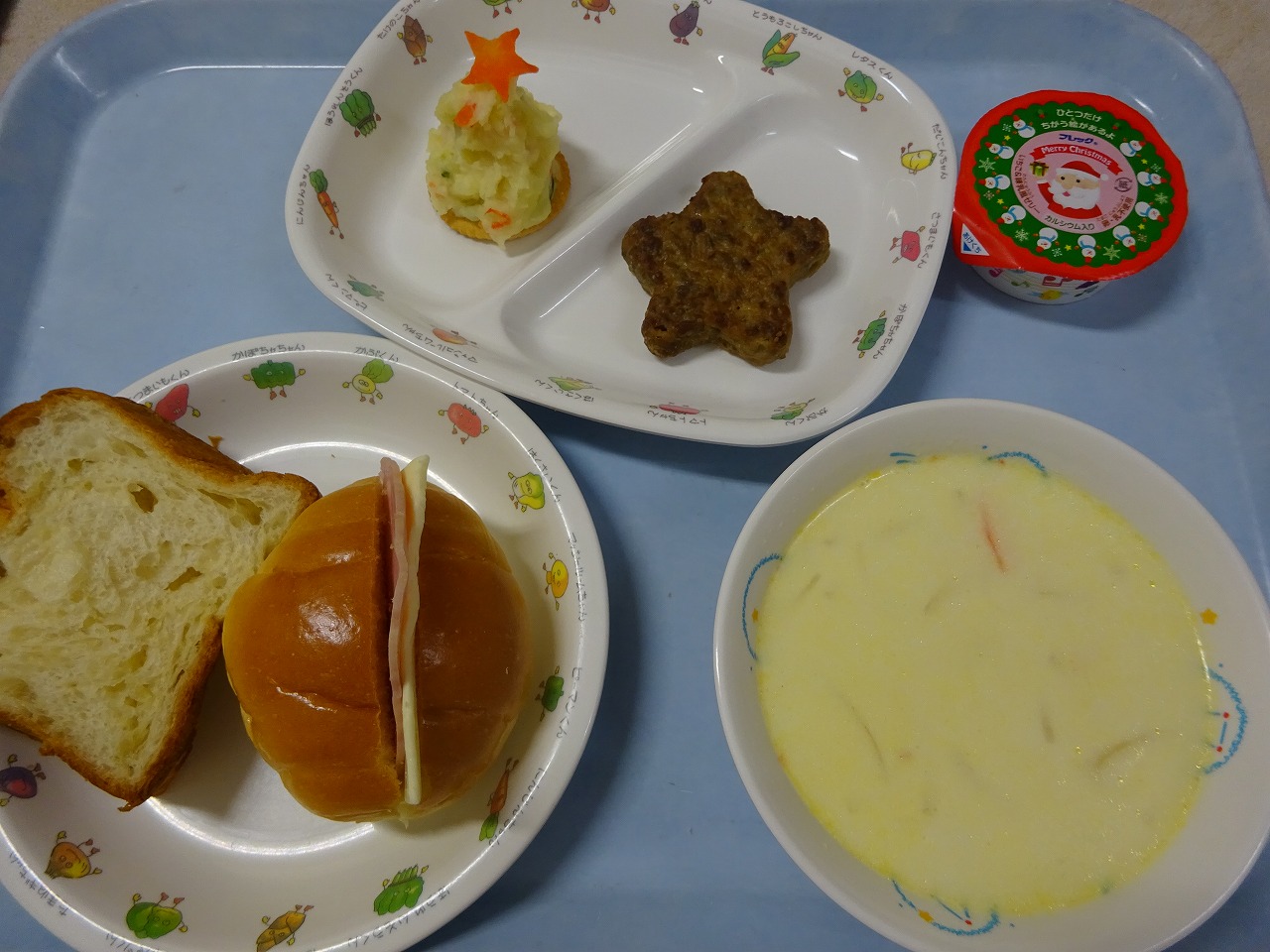12月24日(木)給食 ・ おやつ ・サンドパン(ロールパン・ハム・チーズ) ・ポテトサラダツリー(じゃがいも・きゅうり・にんじん・パプリカ・マヨドレ) ・コーンポタージュ(コーン・クリームコーン・玉ねぎ・にんじん・生クリーム) ・クリスマスデザート(いちごゼリー) おやつは、 ロールケーキ(いちご味)に、ホイップクリームといちごを飾りました。