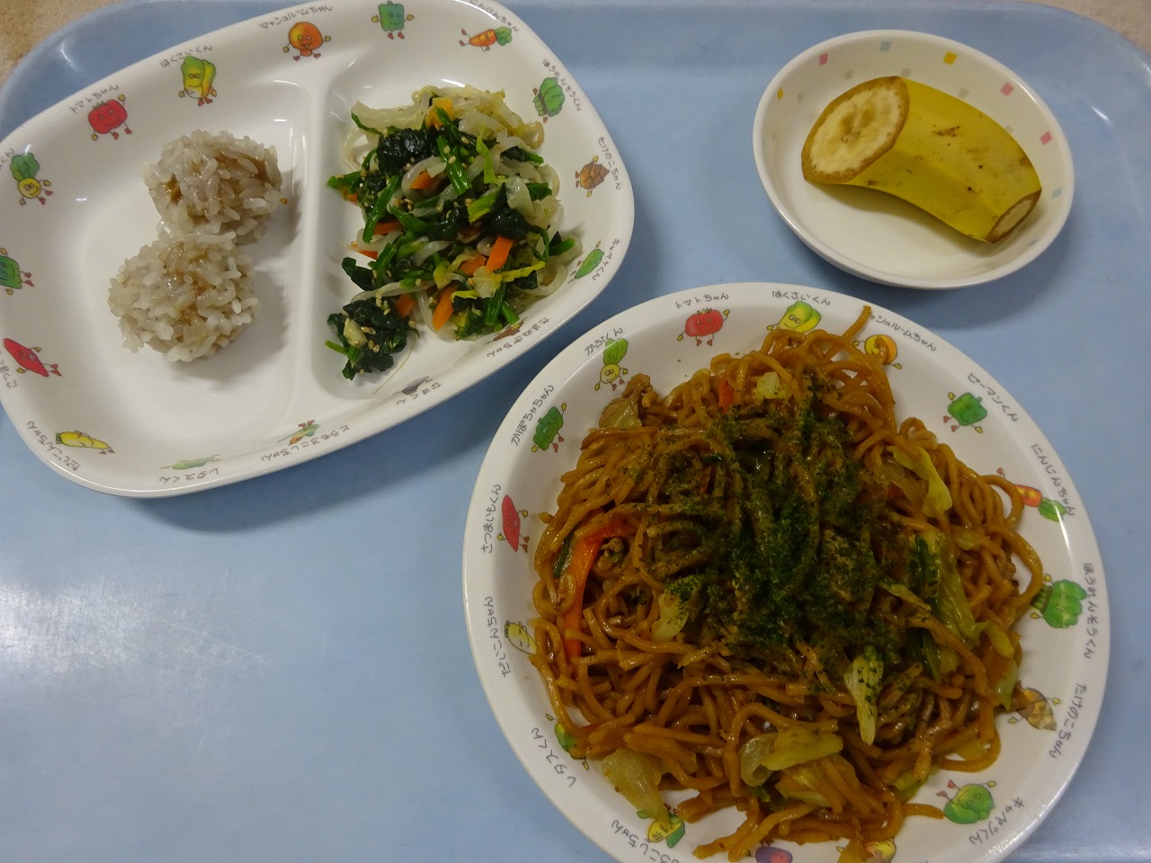 12月25日(金)給食 ・焼きそば(麺・豚肉・キャベツ・にんじん・玉ねぎ・ピーマン・青のり) ・ほうれん草ナムル(ほうれん草・にんじん・もやし・はくさい・ごま) ・肉だんごのもち米蒸し ・バナナ