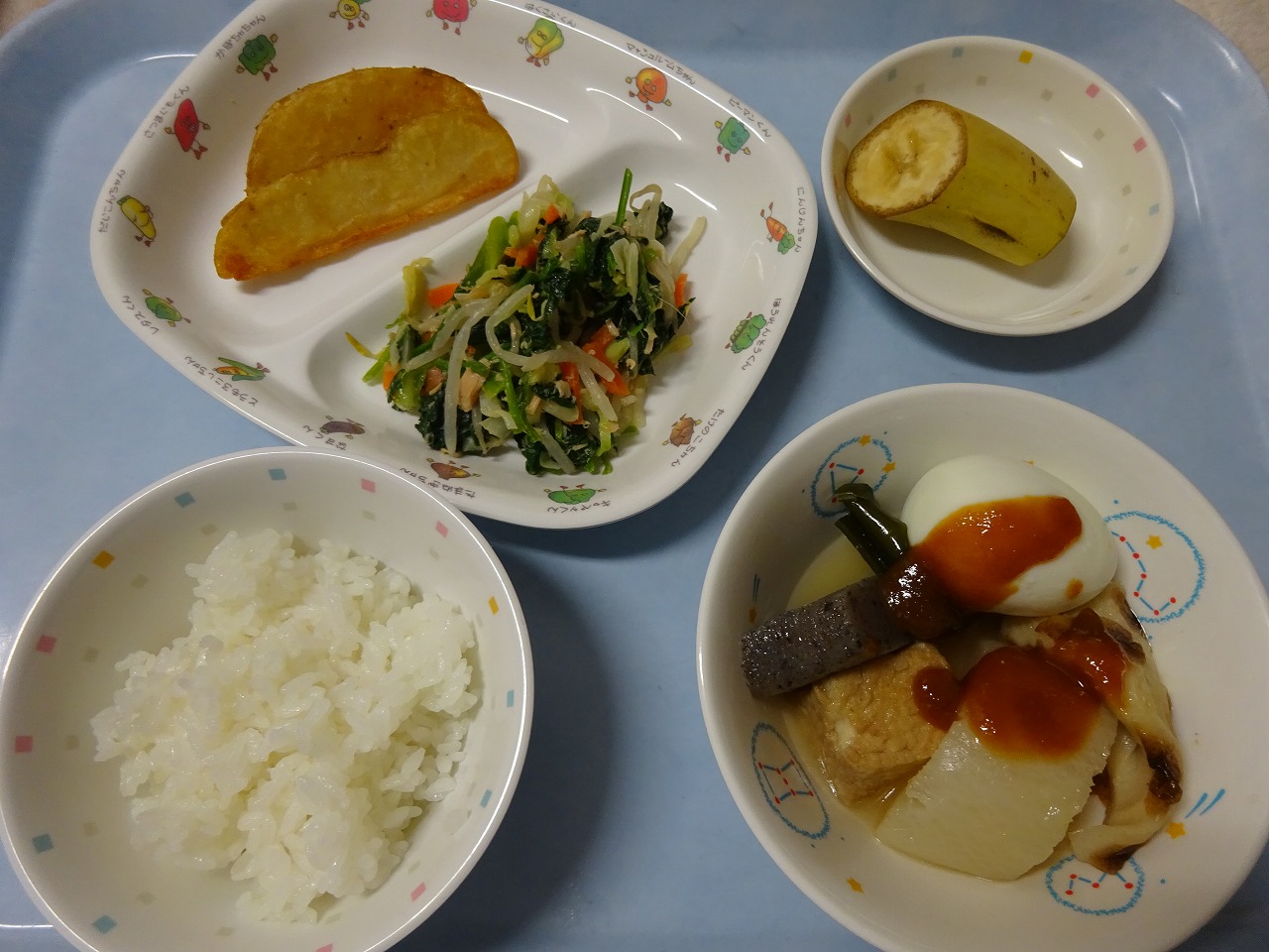 12月4日(金) 給食 ・ごはん ・みそおでん(大根・卵・こんにゃく・ちくわ・厚揚げ・昆布・みそ) ・かわりおひたし(ほうれん草・キャベツ・もやし・にんじん・ツナ) ・フライドポテト ・バナナ