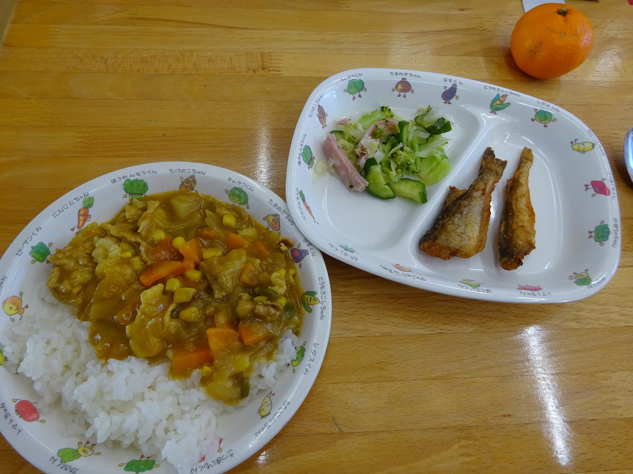 12月7日(月) 給食 ・カレーライス(米・豚肉・じゃがいも・玉ねぎ・にんじん・ピーマン・コーン) ・グリーンサラダ(キャベツ・きゅうり・ブロッコリー・ハム) ・ハタハタの唐揚げ ・みかん