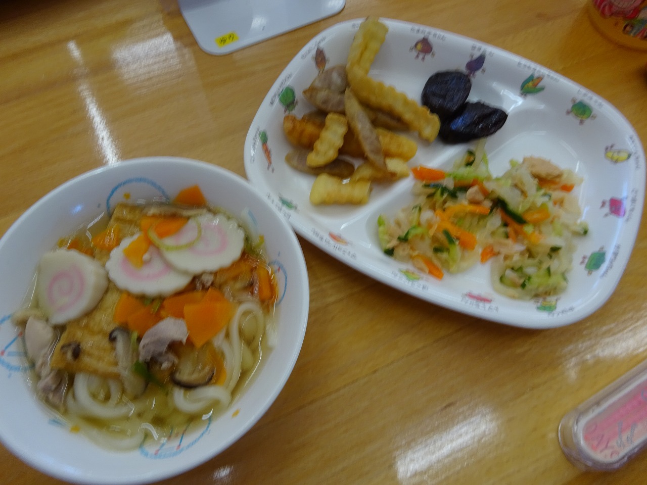12月9日(水)給食 ・きつねうどん(うどん・油揚げ・鶏肉・なると・にんじん・干ししいたけ・ねぎ) ・だいこんサラダ(だいこん・きゅうり・にんじん・キャベツ・ツナ) ・ポテトとウインナー ・プルーン