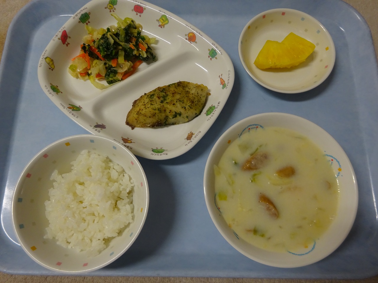 12月15日(火)給食 ・ごはん ・さわらの香味焼き(さわら・バジル・パセリ・にんにく・オリーブ油) ・ほうれん草のごまドレ(ほうれん草・キャベツ・もやし・にんじん・ごま) ・白菜スープ(はくさい・玉ねぎ・にんじん・ウインナー・豆乳) ・パイナップル