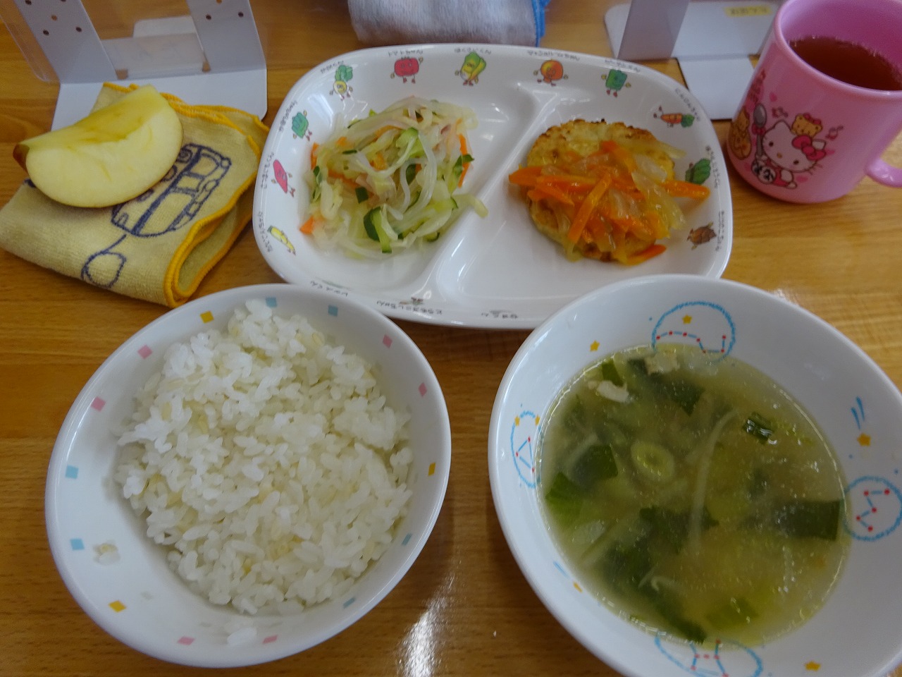 12月17日(木)給食 ・ごはん ・豆腐バーグの野菜あんかけ(豆腐バーグ・玉ねぎ・にんじん) ・バンサンスー(キャベツ・きゅうり・にんじん・マロニー) ・コンソメスープ(べーこん・チンゲン菜・もやし・コーン・ねぎ) ・りんご