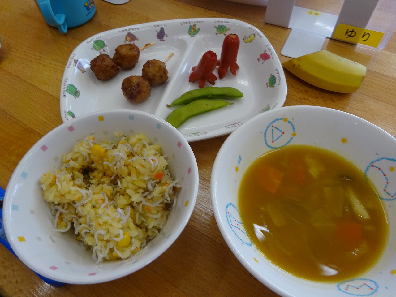 11月26日(木)給食 ・しらすチャーハン(米・しらす・玉ねぎ・にんじん・ピーマン・コーン) ・つくね串 ・タコウインナー・枝豆 ・カレースープ(玉ねぎ・にんじん・しめじ・キャベツ) ・バナナ