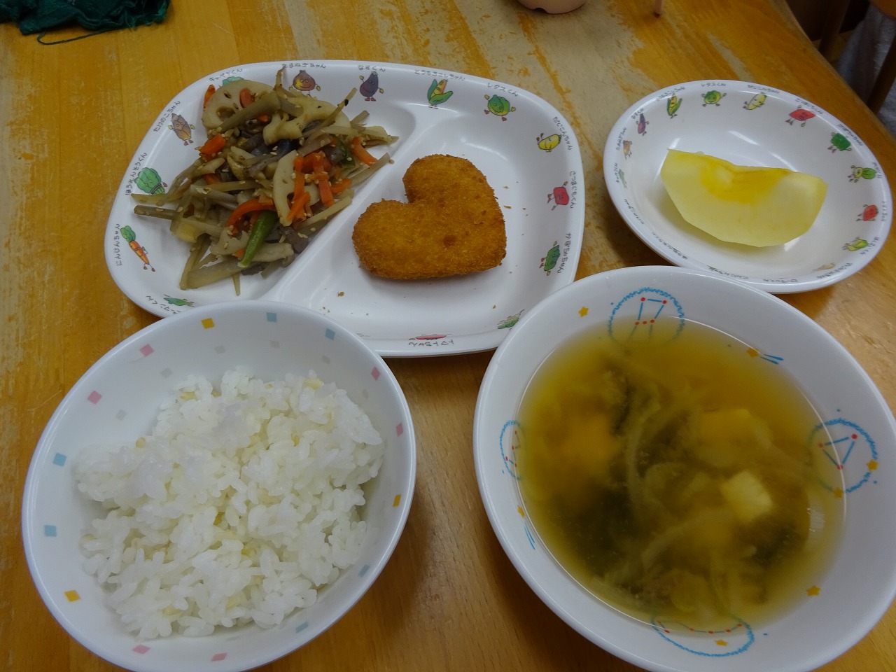 11月27日(金)給食 ・ごはん ・ハートコロッケ ・五目きんぴら(ごぼう・にんじん・れんこん・油揚げ・いんげん・こんにゃく) ・みそ汁(豆腐・玉ねぎ・しいたけ・ねぎ・わかめ・みそ) ・りんご
