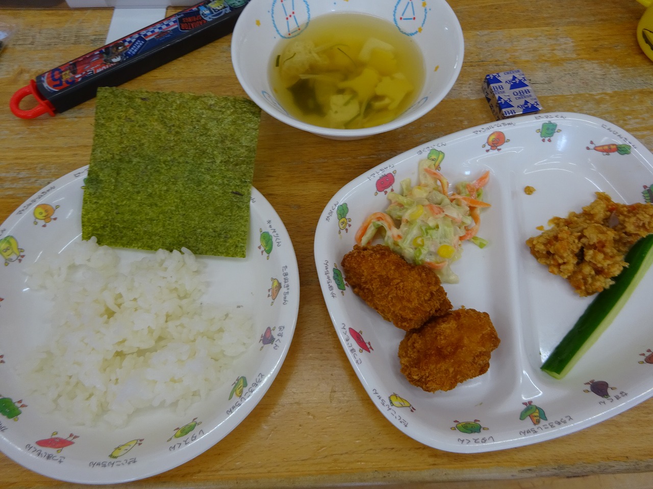11月30日(月)給食 ・手巻き寿司(米・肉みそ・きゅうり・のり) ・いかの厚切りフライ ・ツナマヨサラダ(ツナ・キャベツ・にんじん・コーン・マヨドレ) ・すまし汁(豆腐・かまぼこ・えのきたけ・油揚げ・ねぎ) ・チーズ